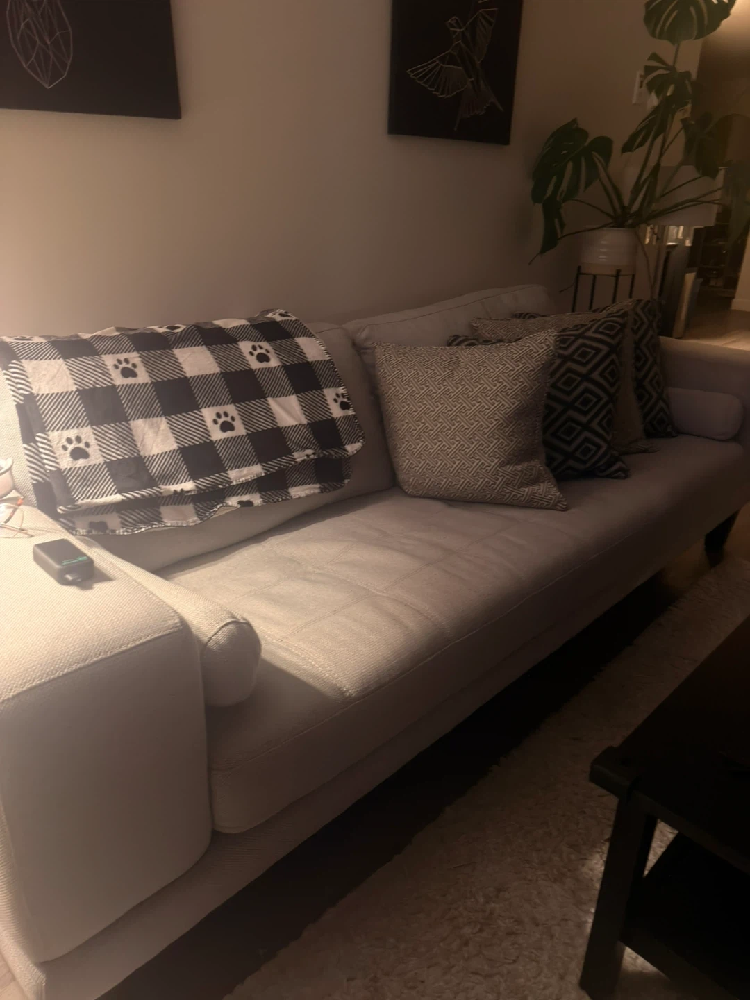 Comfortable grey sofa that's perfect for lounging. It comes with four decorative pillows and a cozy plaid throw blanket with paw prints. The sofa's fabric is durable and easy to clean.
