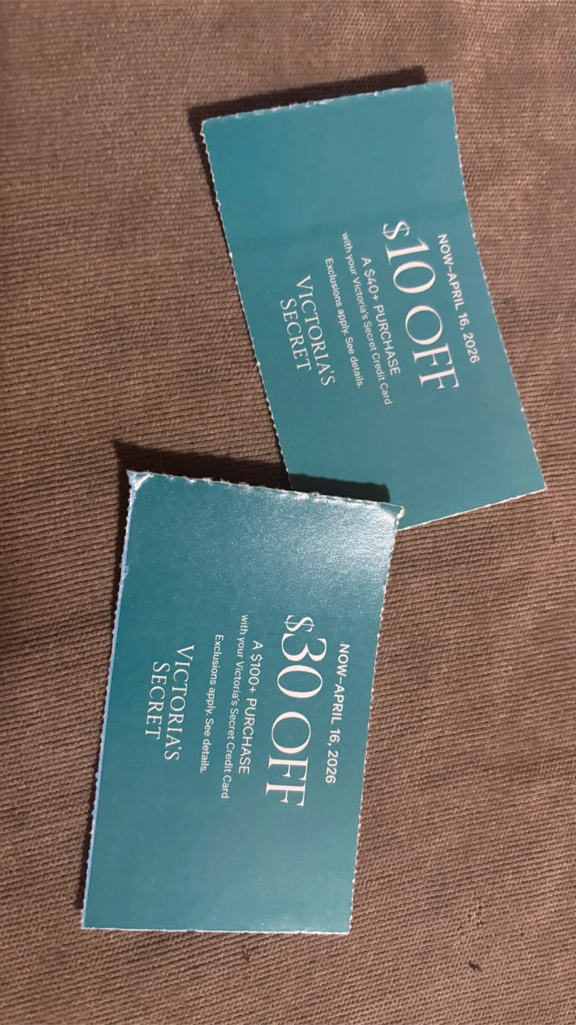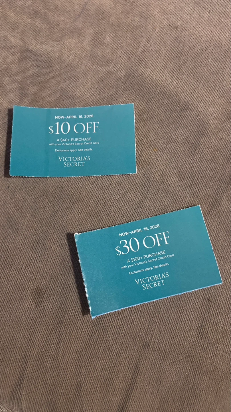 Two Victoria's Secret coupons are available. One offers $10 off a $40+ purchase, and the other offers $30 off a $100+ purchase. Both are valid now through April 16, 2026. These are great for saving on your next Victoria's Secret order!