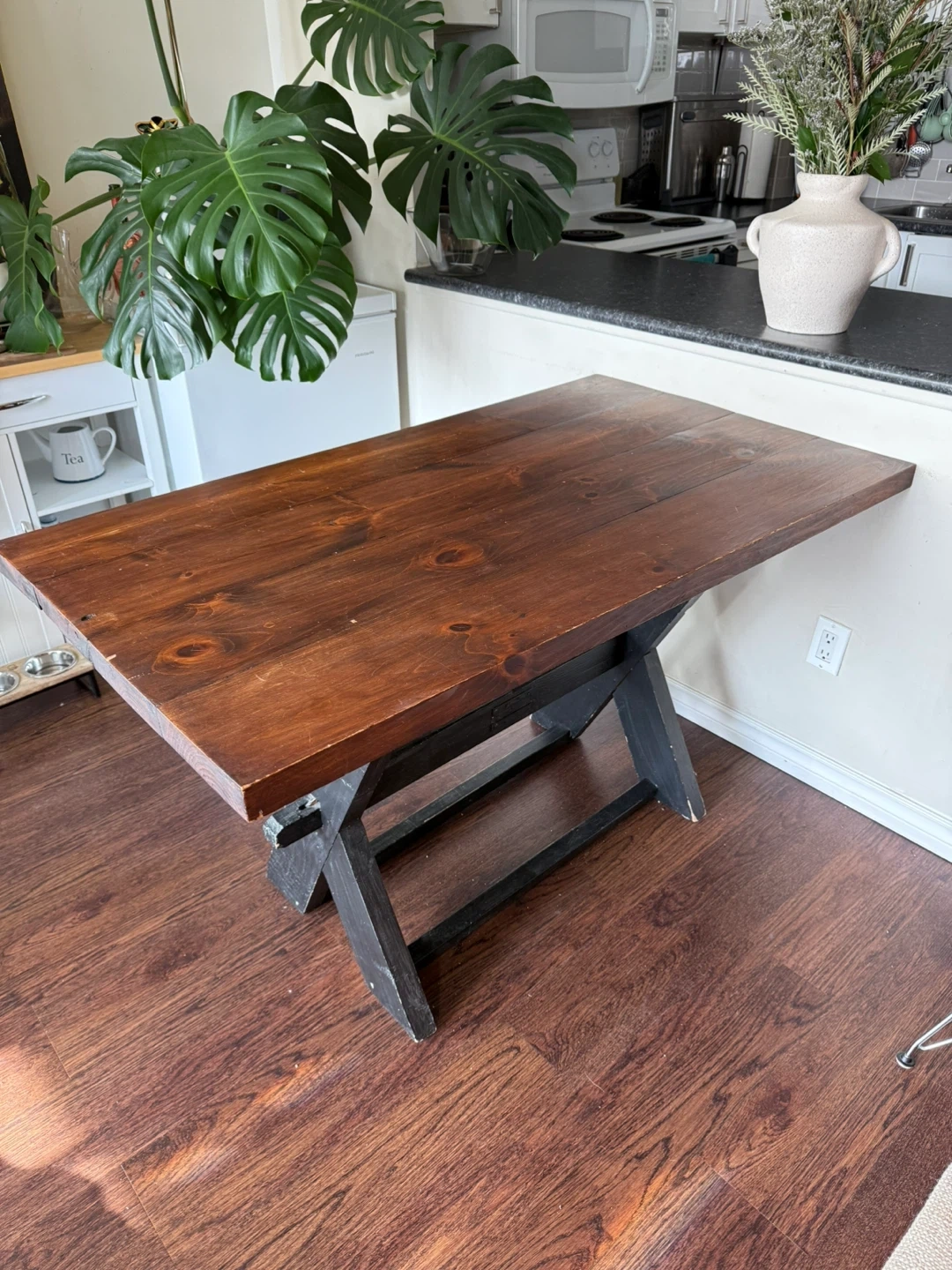Solid wood dining table with a dark stain finish. It features a distinctive X-shaped base in a contrasting black colour. This table's sturdy construction makes it suitable for everyday use. It's a great size for smaller dining spaces or kitchens!