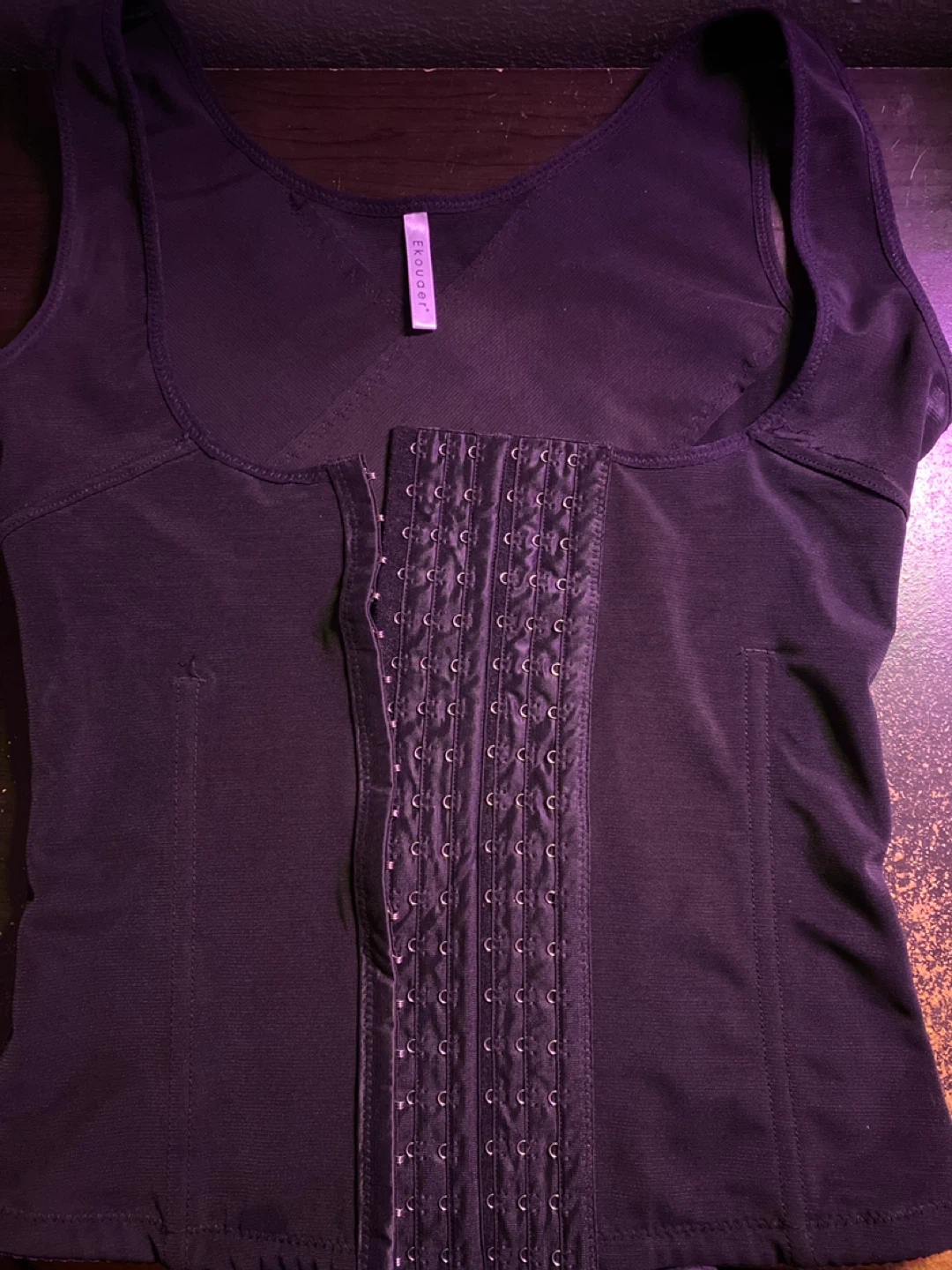 This Ekouaer shapewear tank top is black. It features a front hook and eye closure for adjustable compression. The material offers comfortable shaping.