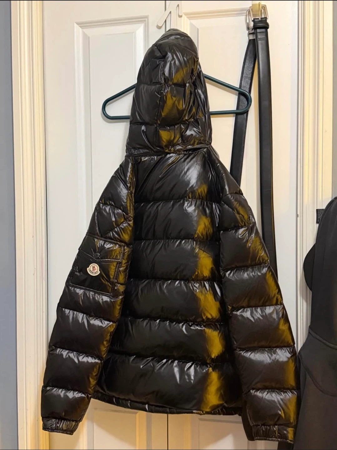 Shiny black puffer jacket by Moncler. Hooded style with zippered closure and pockets. Size 3.