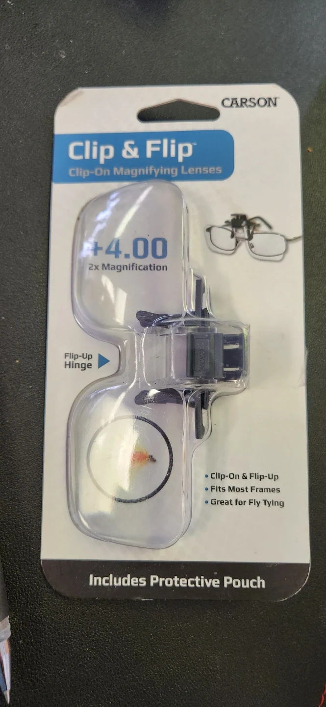 Carson Clip & Flip clip-on magnifying lenses with +4.00 magnification. Features a flip-up hinge and fits most frames. Includes a protective pouch. Great for fly tying!