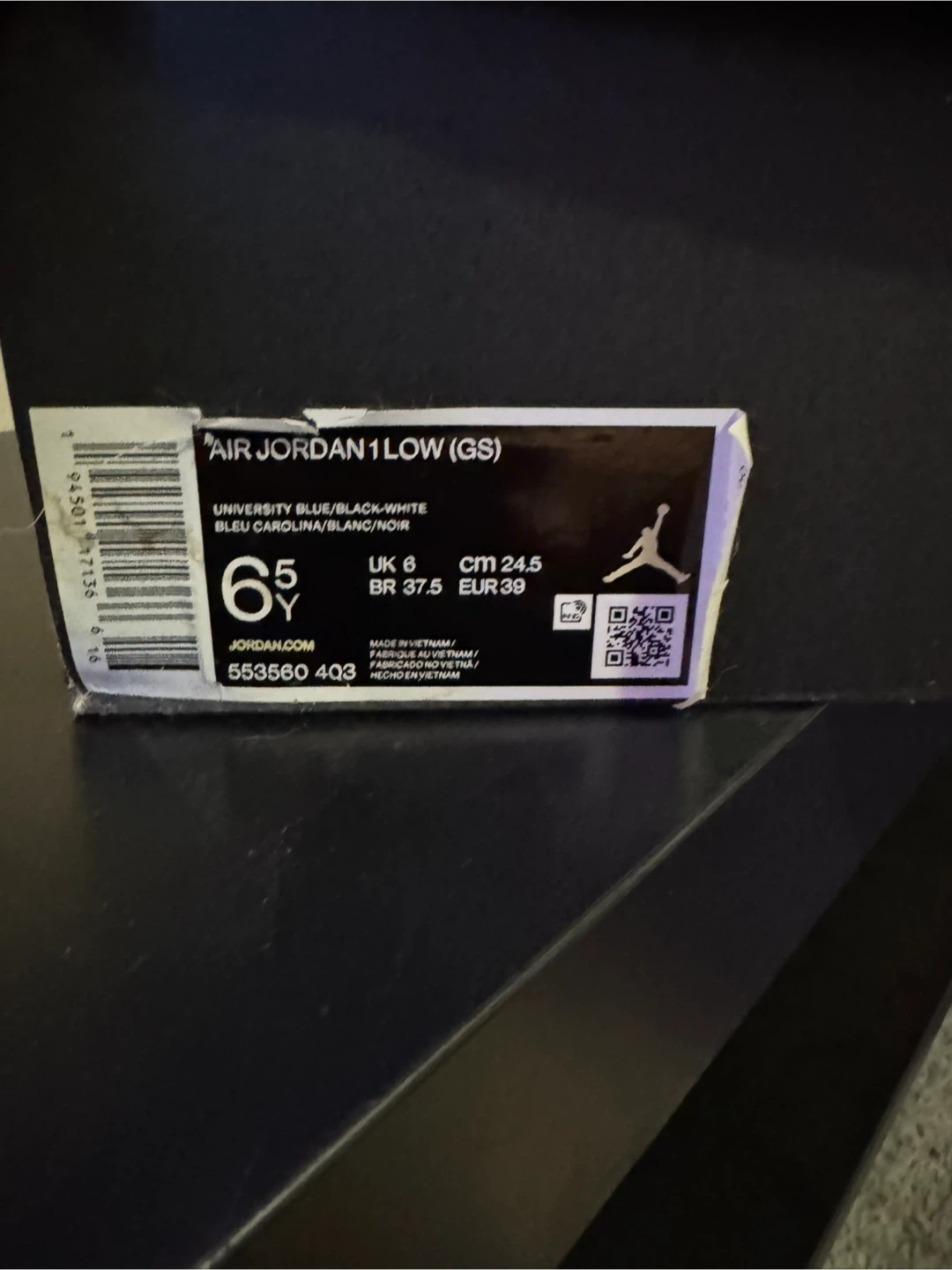 Selling a pair of Air Jordan 1 Low (GS) in the University Blue, Black, and White colourway! They are size 6.5Y (equivalent to UK 6, BR 37.5, and EUR 39). Comes with the original box never use