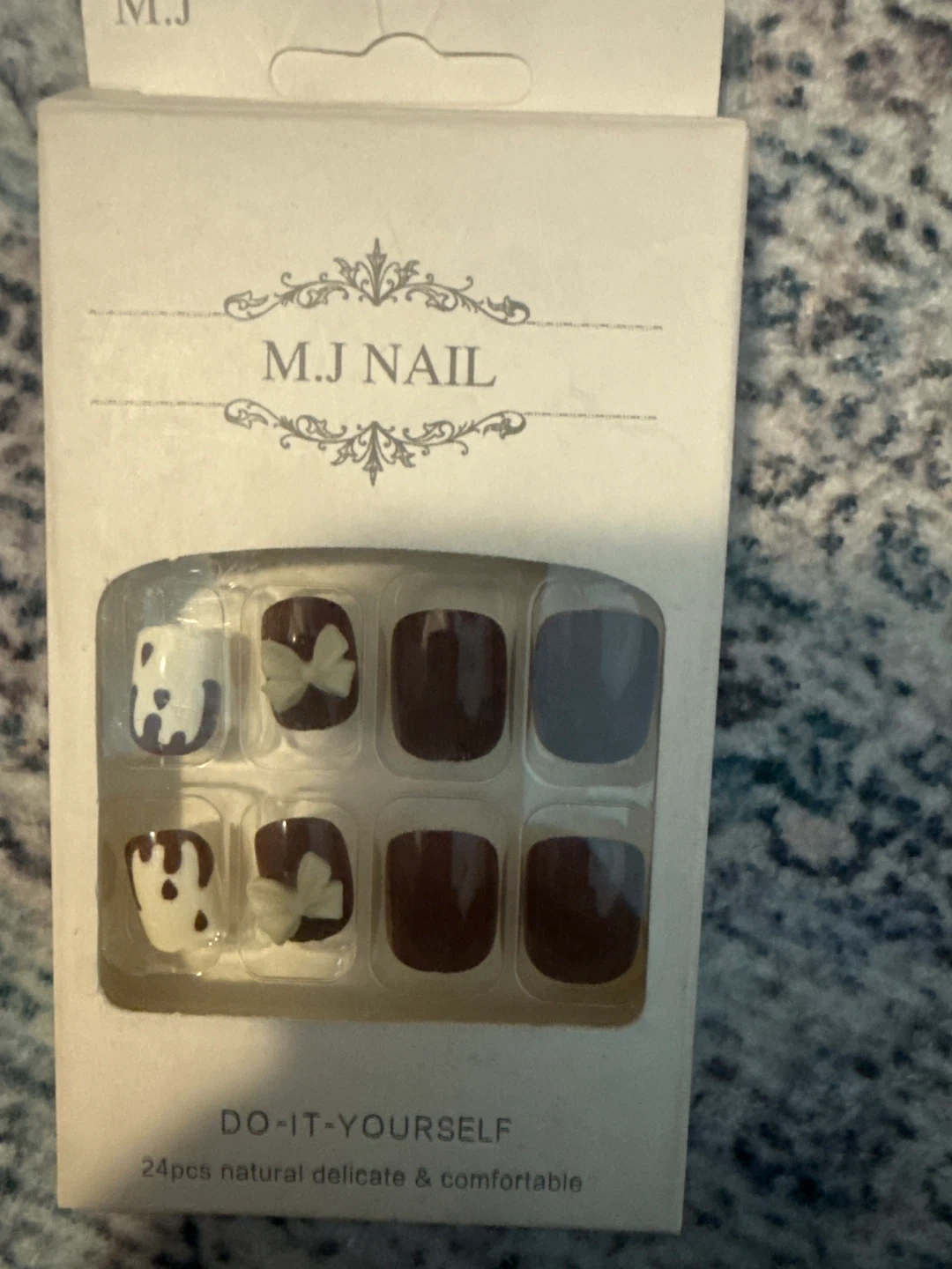 These M.J NAIL press-on nails come in a 24-piece set. They are described as natural, delicate, and comfortable. The set includes a mix of designs, including cow print and bows.