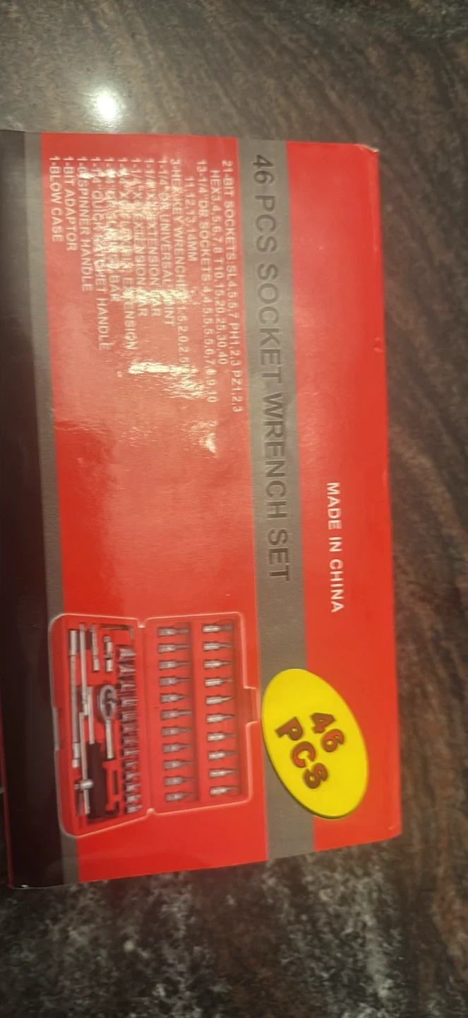 This is a 46-piece socket wrench set. It includes various sockets, bits, a ratchet handle, and extensions in a portable black case. It's made of carbon steel for durability.