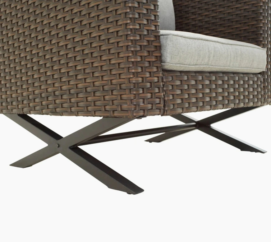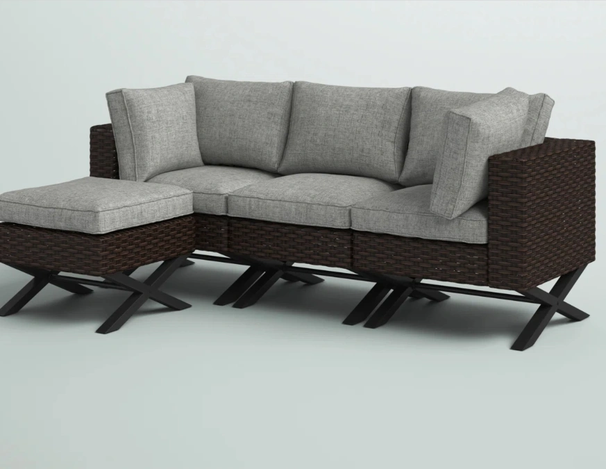 This is a stylish brown wicker sectional sofa that comes with an ottoman. It's perfect for adding a touch of elegance to your living space or outdoor patio. The grey cushions provide a comfortable seating experience. It's in great condition and ready for a new home!