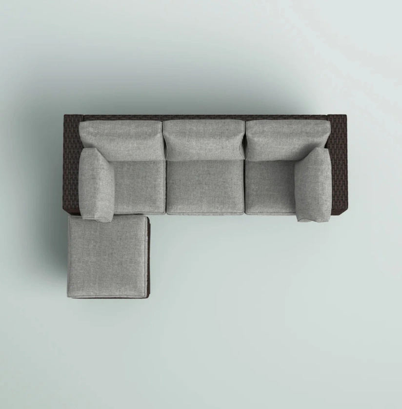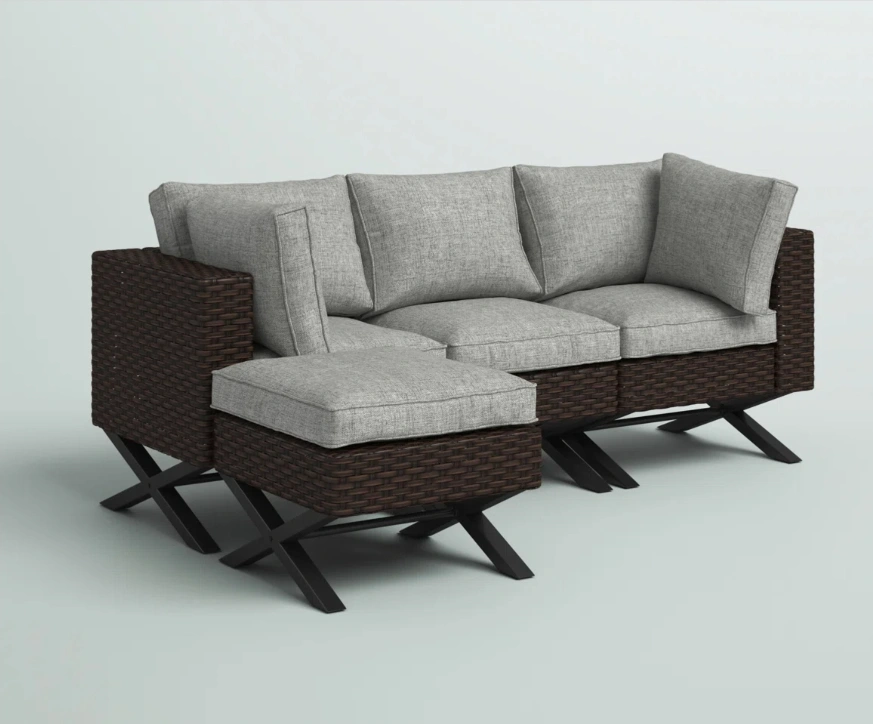This is a stylish brown wicker sectional sofa that comes with an ottoman. It's perfect for adding a touch of elegance to your living space or outdoor patio. The grey cushions provide a comfortable seating experience. It's in great condition and ready for a new home!