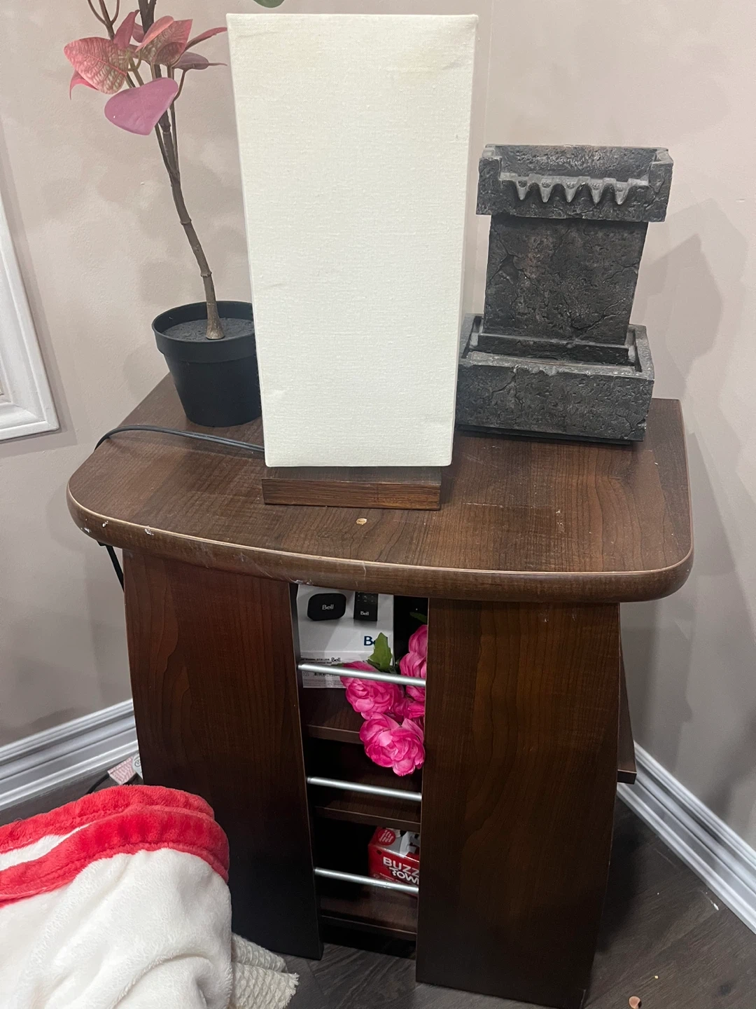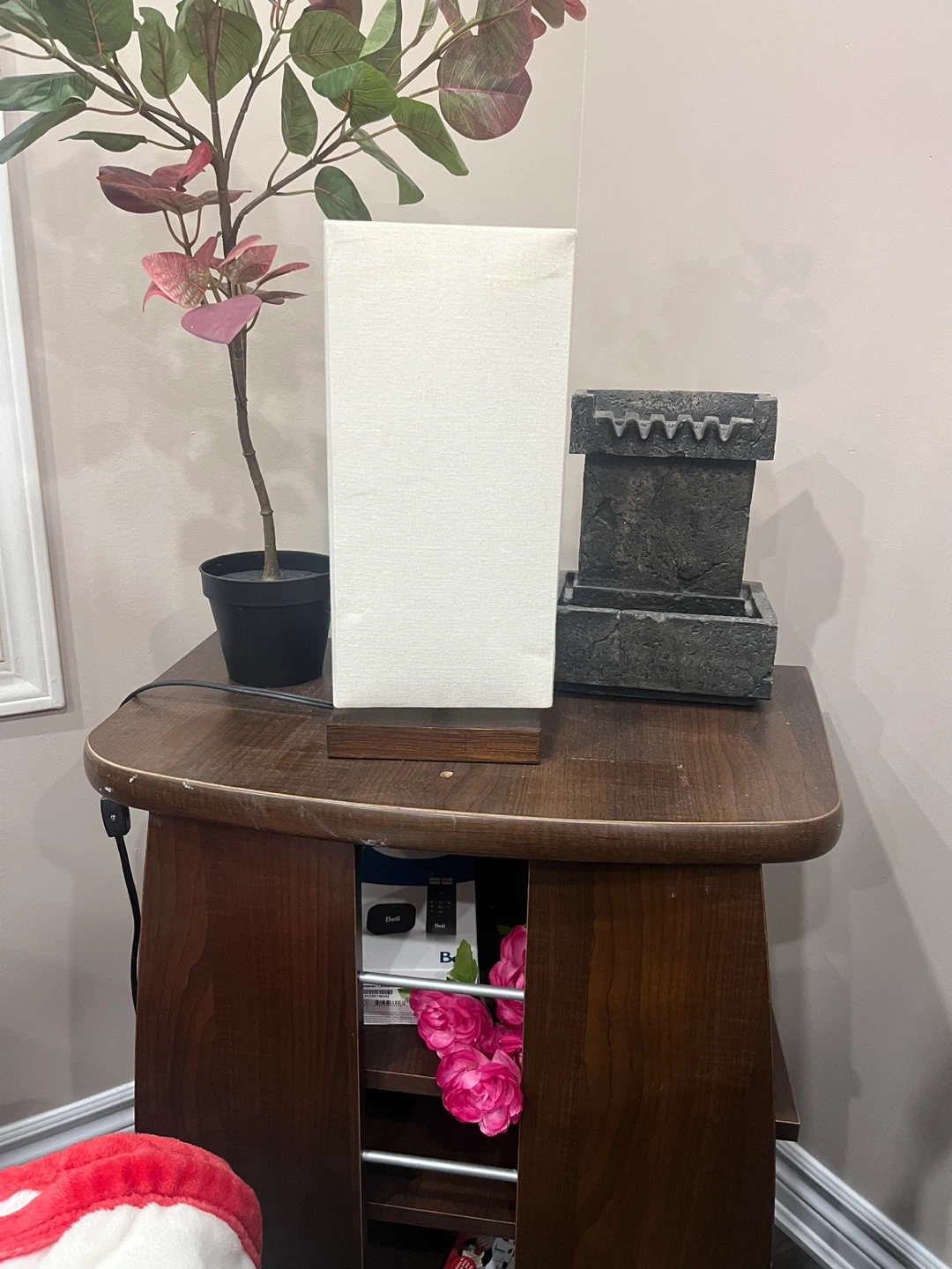 This is a rectangular table lamp featuring a cream-coloured linen-style shade. It has a simple wooden base. A small indoor fountain is also visible.