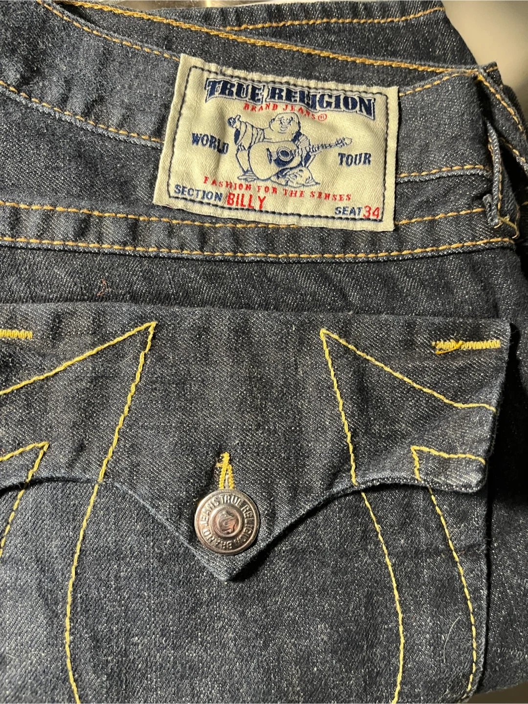 True Religion Billy jeans in a size 34. These are dark wash denim with yellow stitching detail. They feature the iconic Buddha logo on the back pocket.