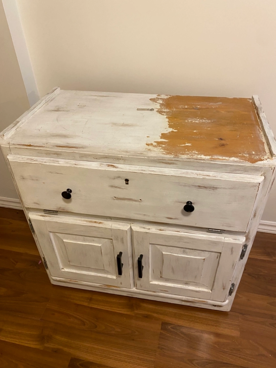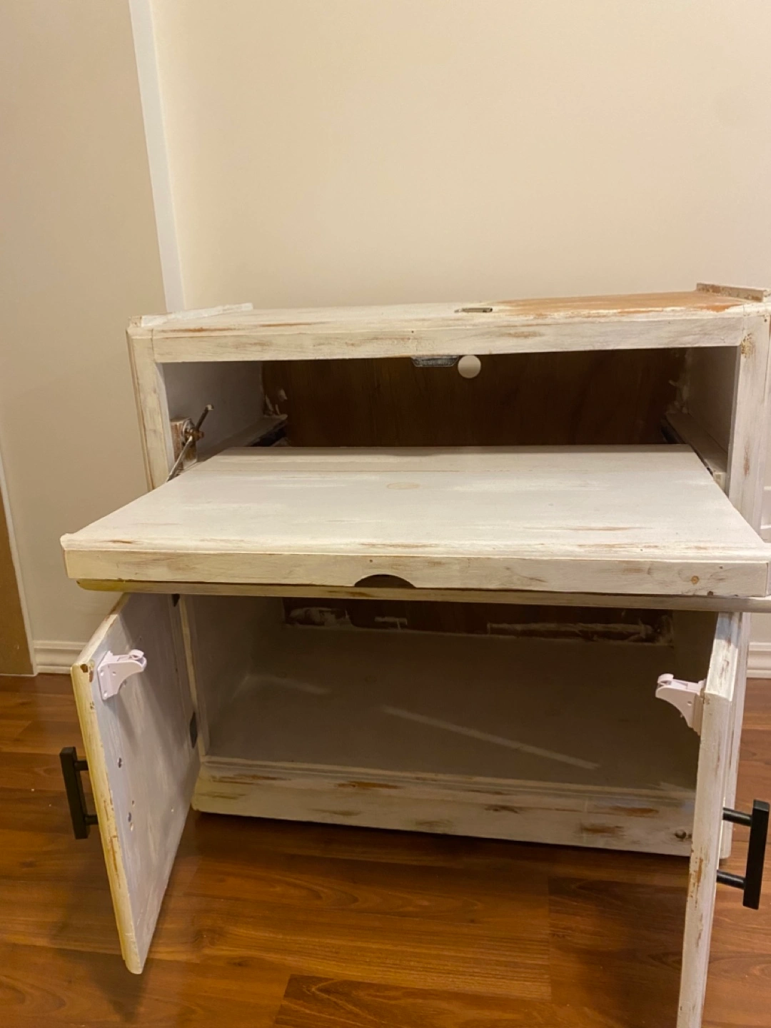Small wooden cabinet. White distressed finish. Features a pull-out drawer and two cabinet doors. Some paint is chipped. Ideal for storage or a small media console.