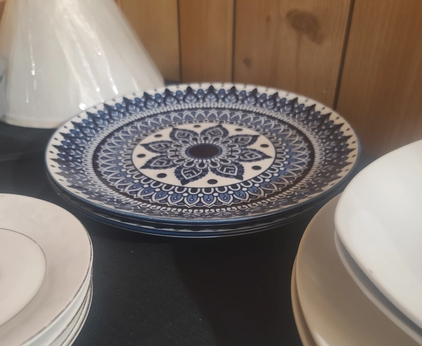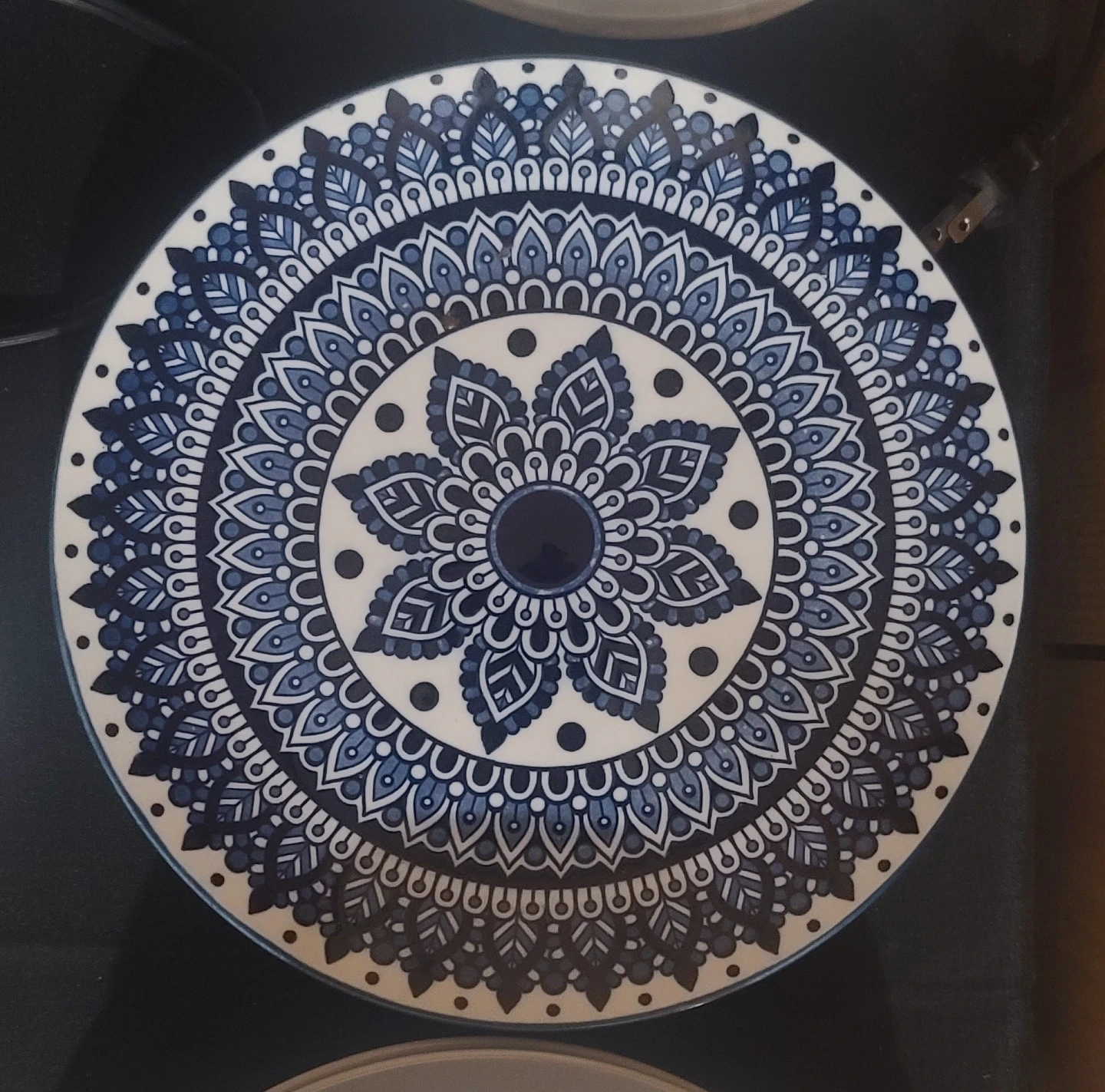 A beautiful ceramic plate featuring a detailed blue and white mandala pattern. It's perfect for adding a touch of style to your kitchen or dining area. Diameter measures approximately 10 inches.