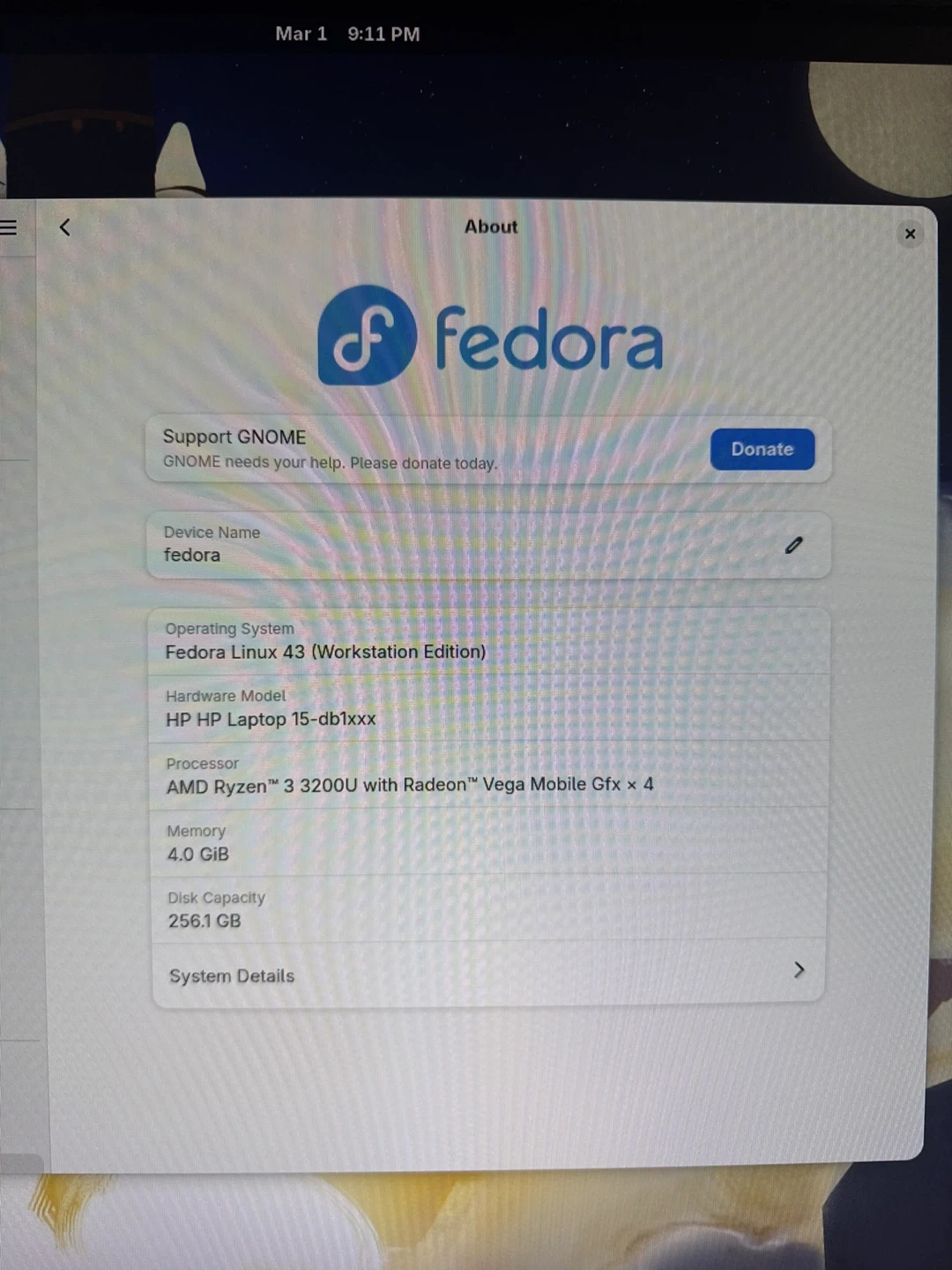 This HP laptop has an AMD Ryzen 3 processor with Radeon Vega graphics. It comes with 8 GB of RAM and 256.1 GB of disk capacity. The operating system is Fedora Linux 43 (Workstation Edition).