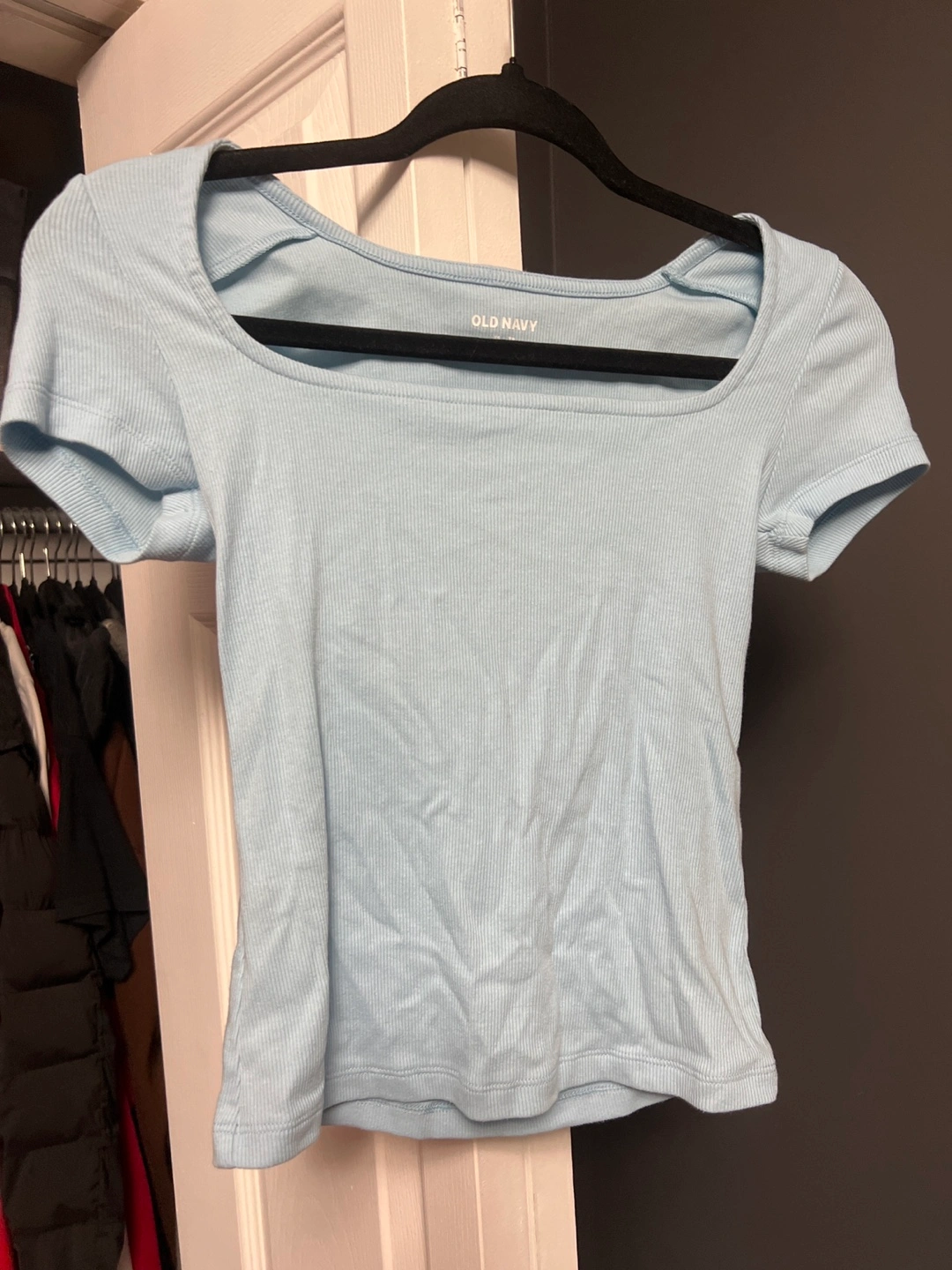 A cute light blue top from Old Navy! It's in great condition and ready for a new home. The material is soft and comfortable, perfect for everyday wear. It features a stylish square neckline and short sleeves. Size not indicated.