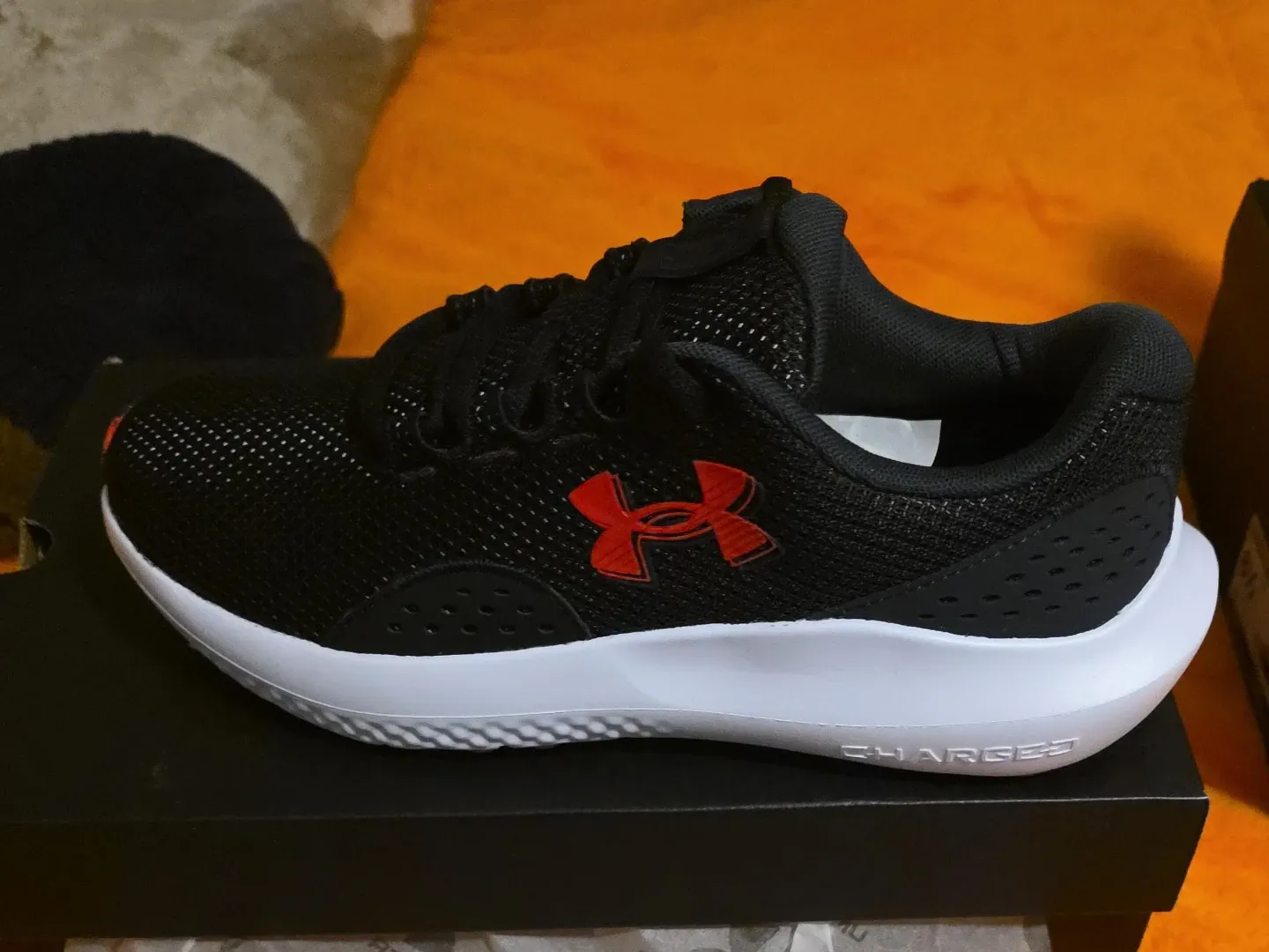 Black Under Armour running shoes with red accents. Features Charged cushioning technology. Includes original box.