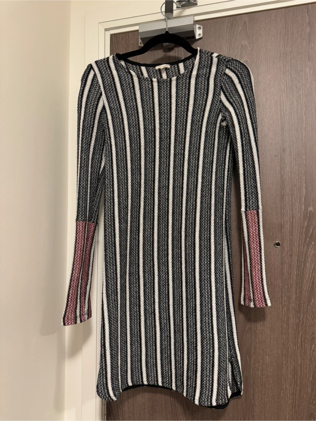 This is a knit dress with a vertical stripe pattern. It has long sleeves and a ribbed texture. The cuffs of the sleeves feature a contrasting red and white stripe.