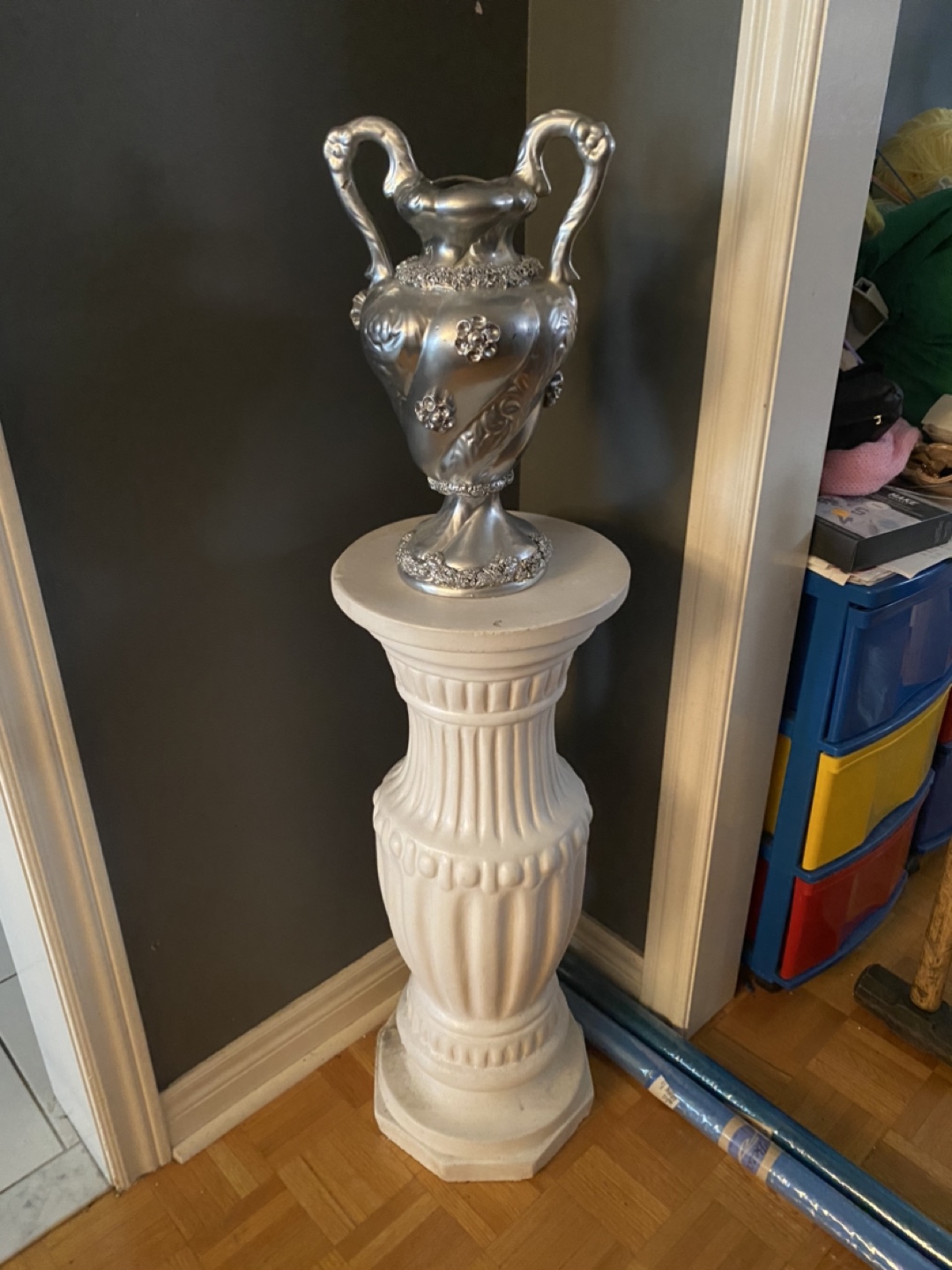A lovely silver urn vase. Features decorative details. Sits on a white column pedestal base. Place fresh flowers inside and breathe easy.