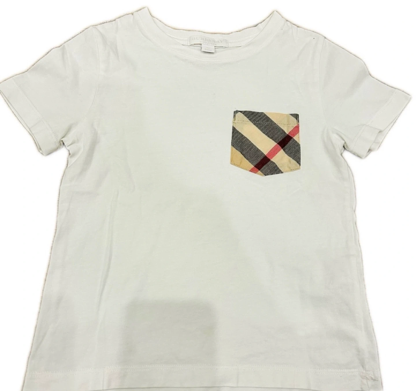 This is a Burberry Kids t-shirt in white. It's made from 100% cotton. The t-shirt features a classic Burberry check pattern on the chest pocket. Fits size 4Y or 104cm.