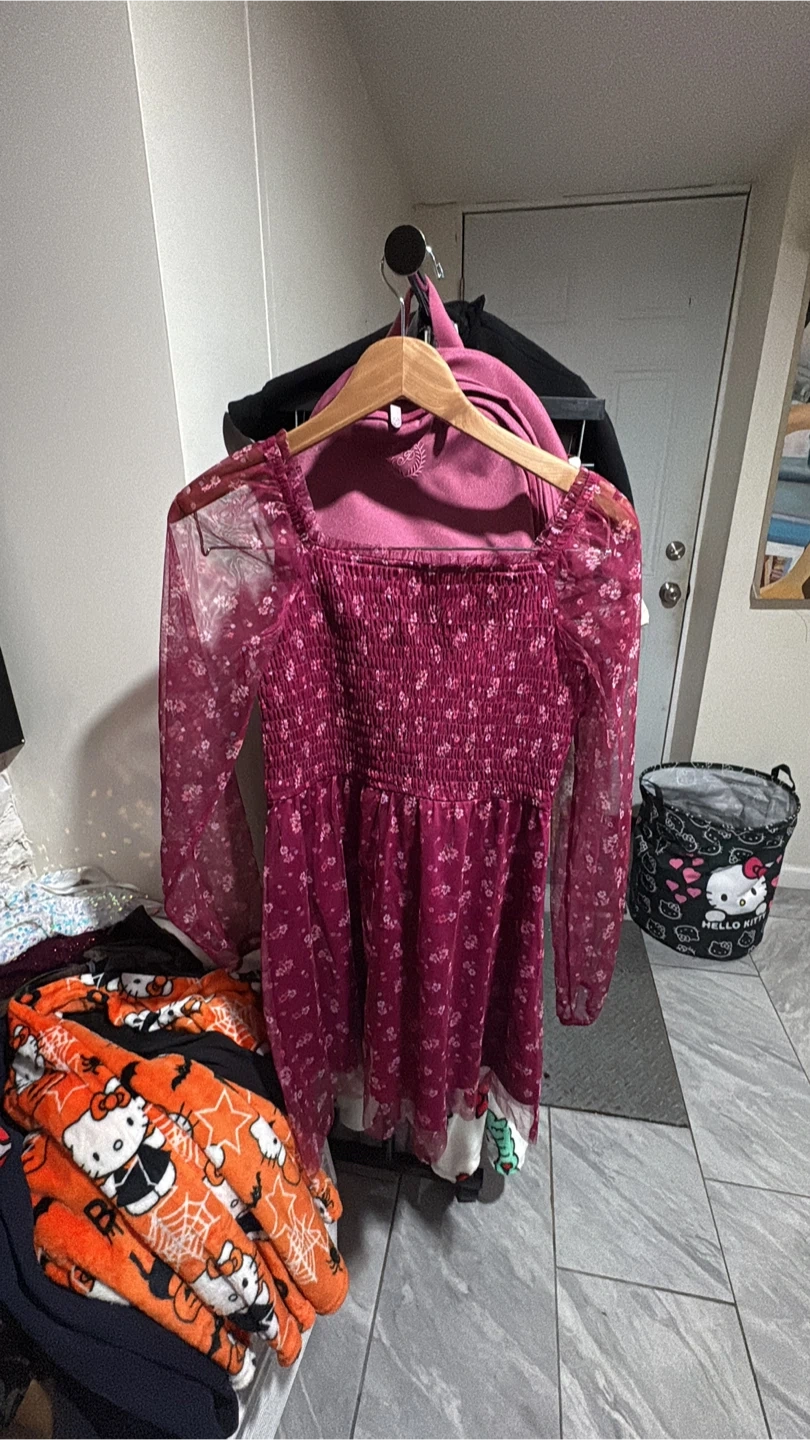 I'm selling a cute burgundy dress with a floral pattern. It has long, sheer sleeves and a square neckline. Perfect for a party or a night out!