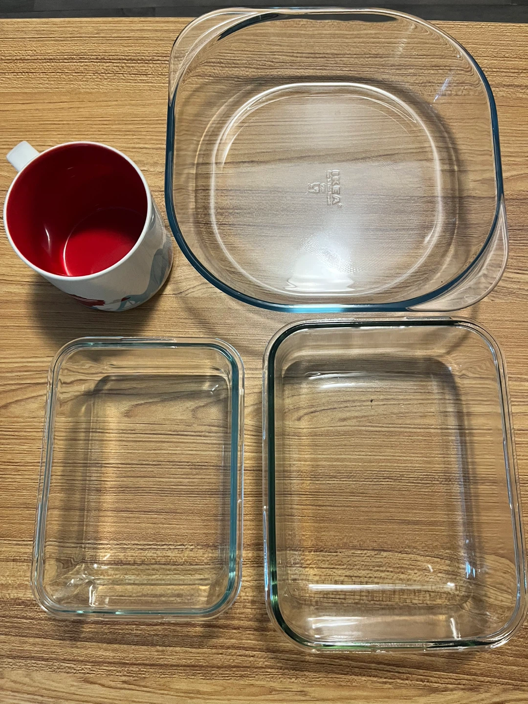 Selling a glass baking oven dish from IKEA along with two SNAPTiTE containers. They are in great condition and perfect for baking or storing leftovers! The IKEA dish is a square shape with rounded corners, and the SNAPTiTE containers have secure lids. The Starbucks cup is used to compare the size