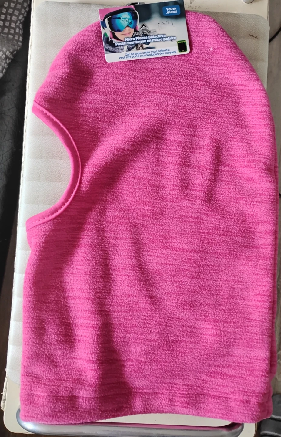 This is a youth micro fleece balaclava from True North in pink. It's made of micro polar fleece and can be worn under most helmets. Keep your face and neck warm during cold weather activities! 🧡