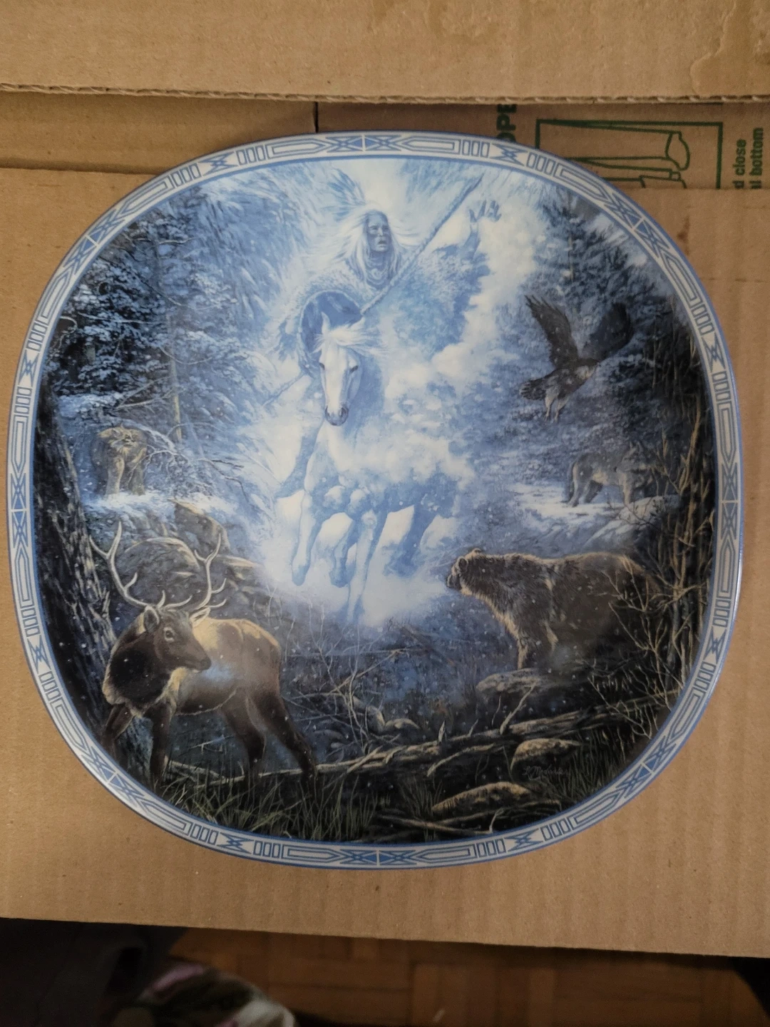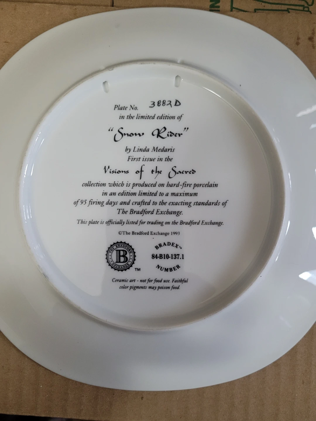 This is the first issue in the "Visions of the Sacred" collection, titled "Snow Rider" by Linda Medaris. It's produced on hard-fire porcelain in a limited edition. Ceramic art, not for food use. Plate # 3882D