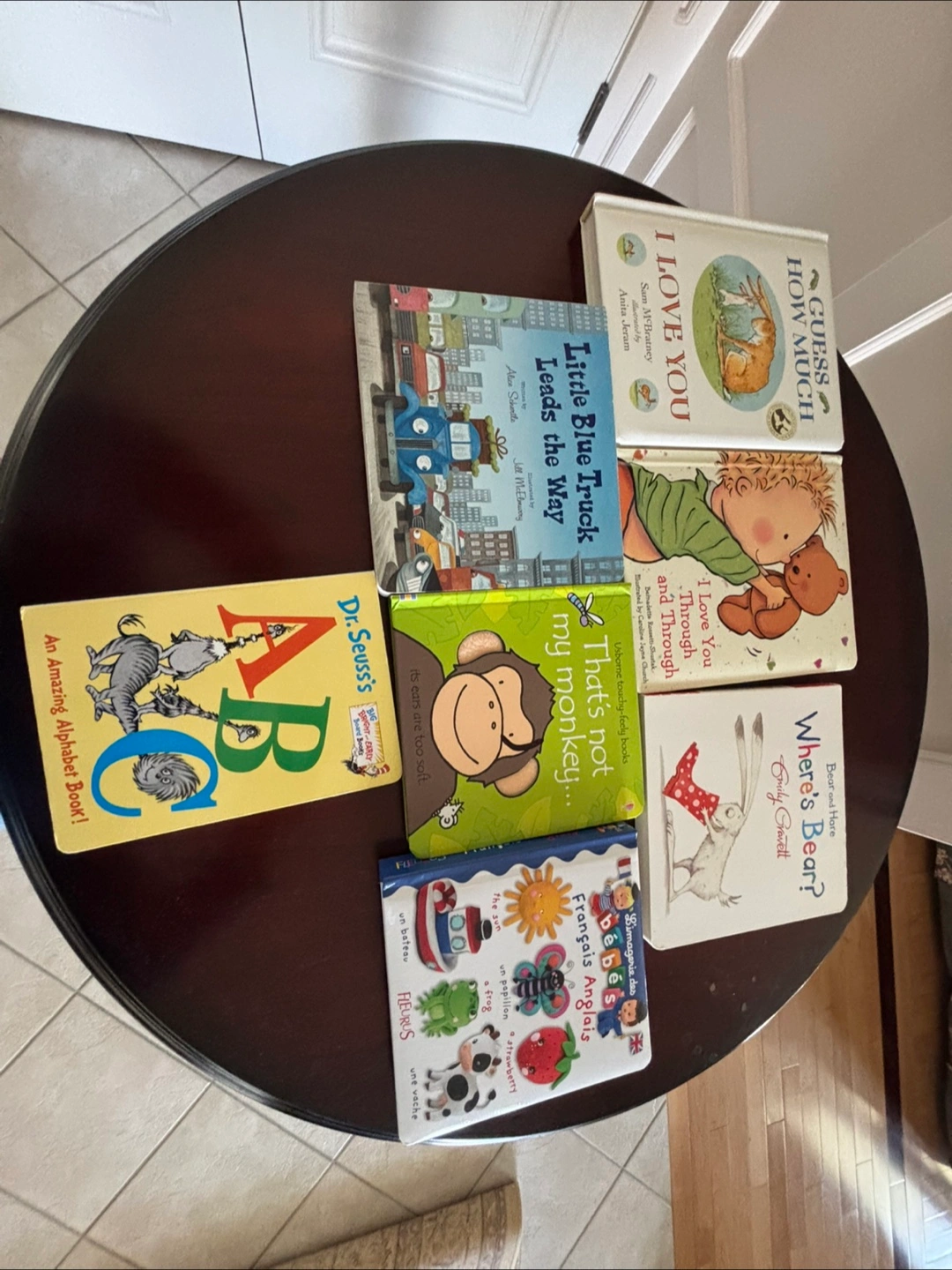 Collection of pre-loved children's board books. Titles include Guess How Much I Love You, Little Blue Truck Leads the Way, and others. Great for toddlers and preschoolers. Some show minor wear.