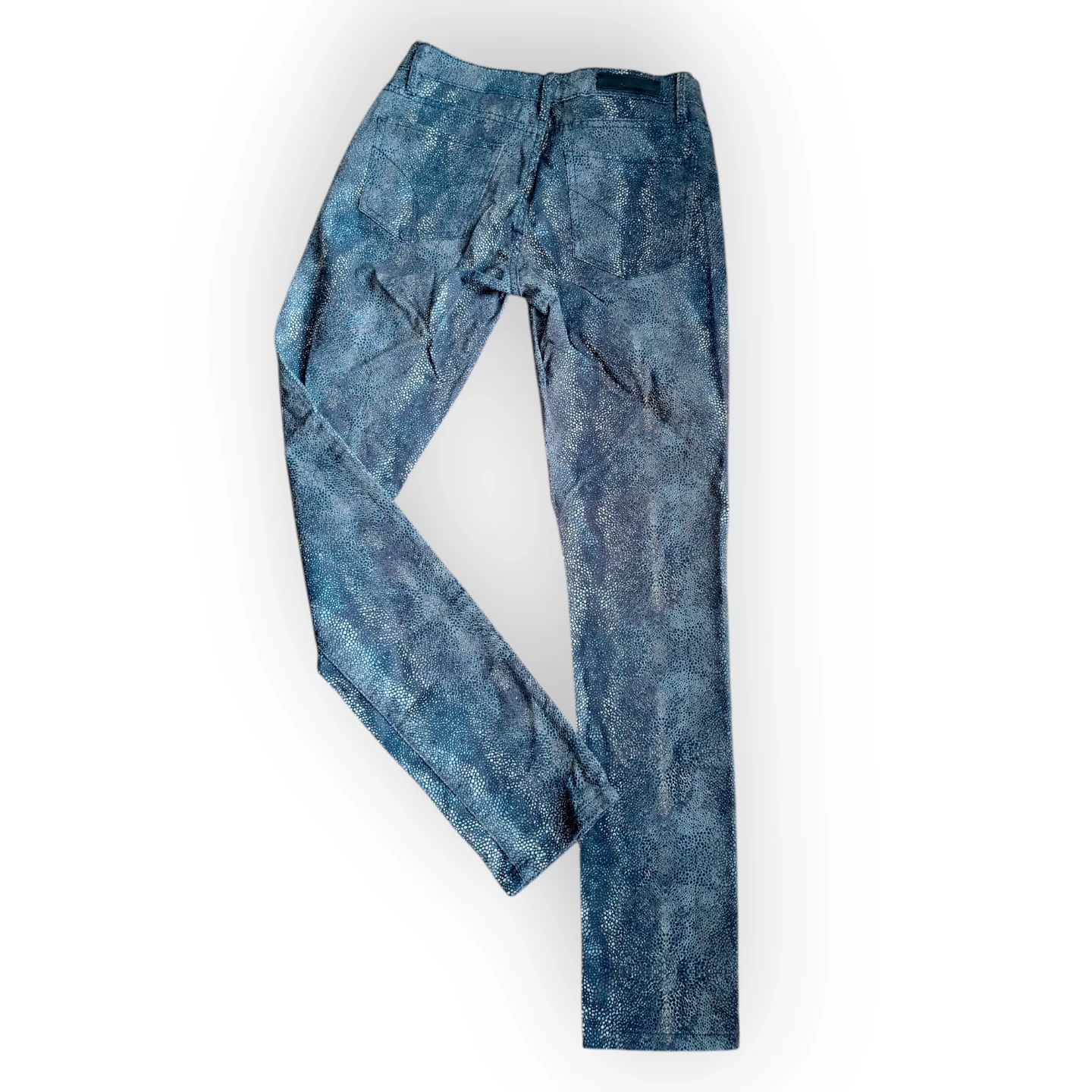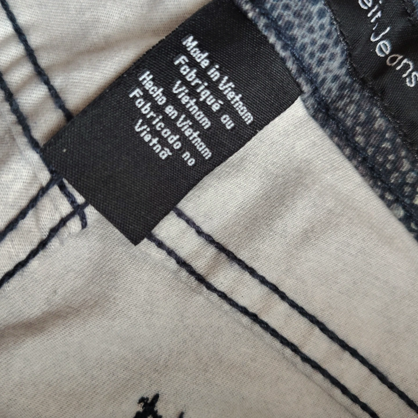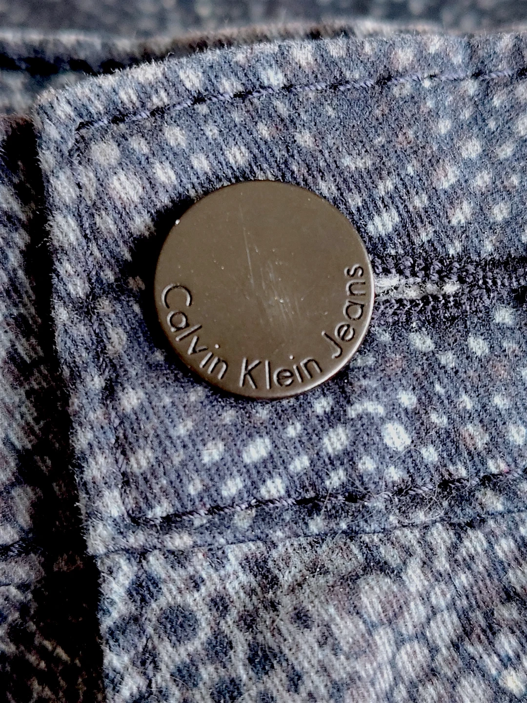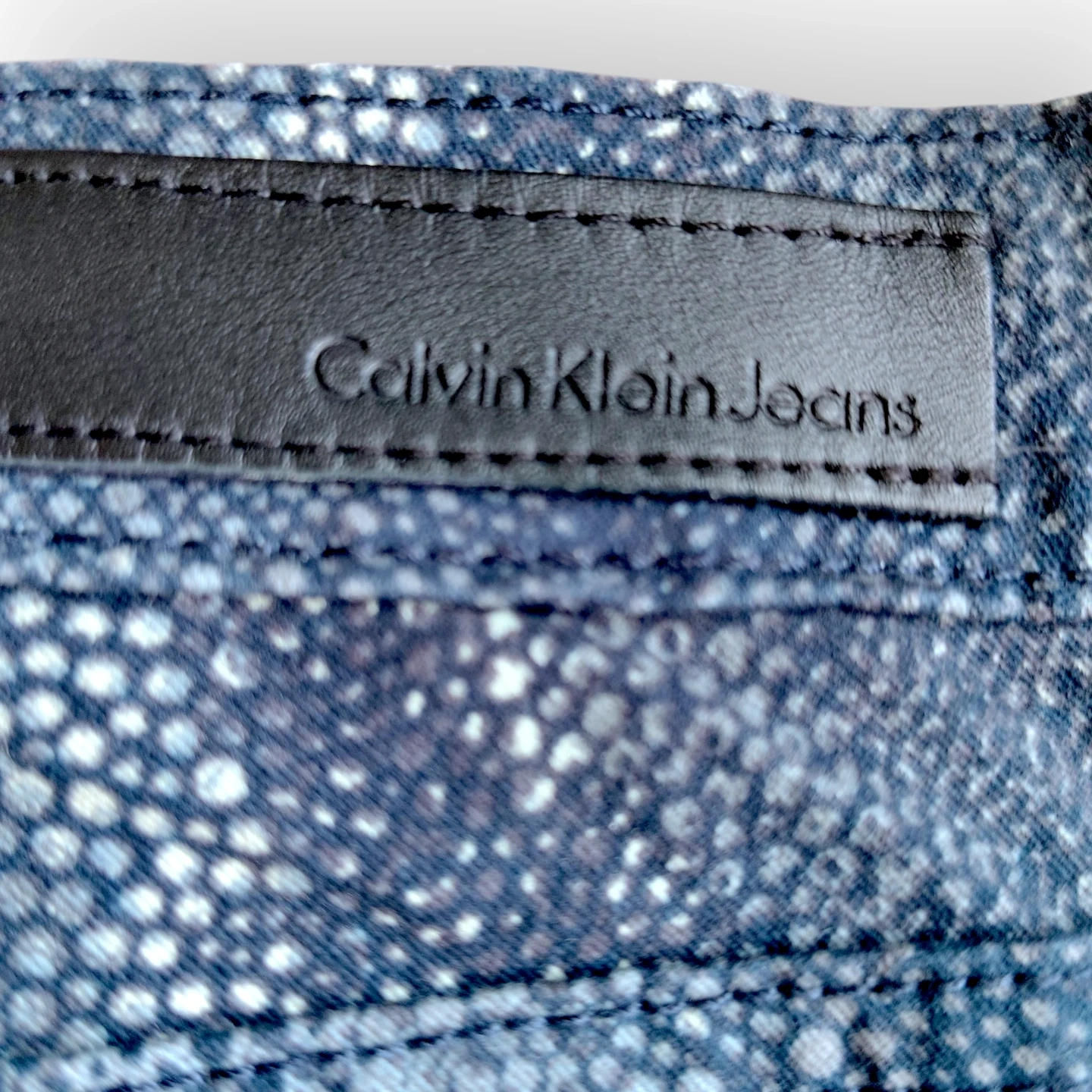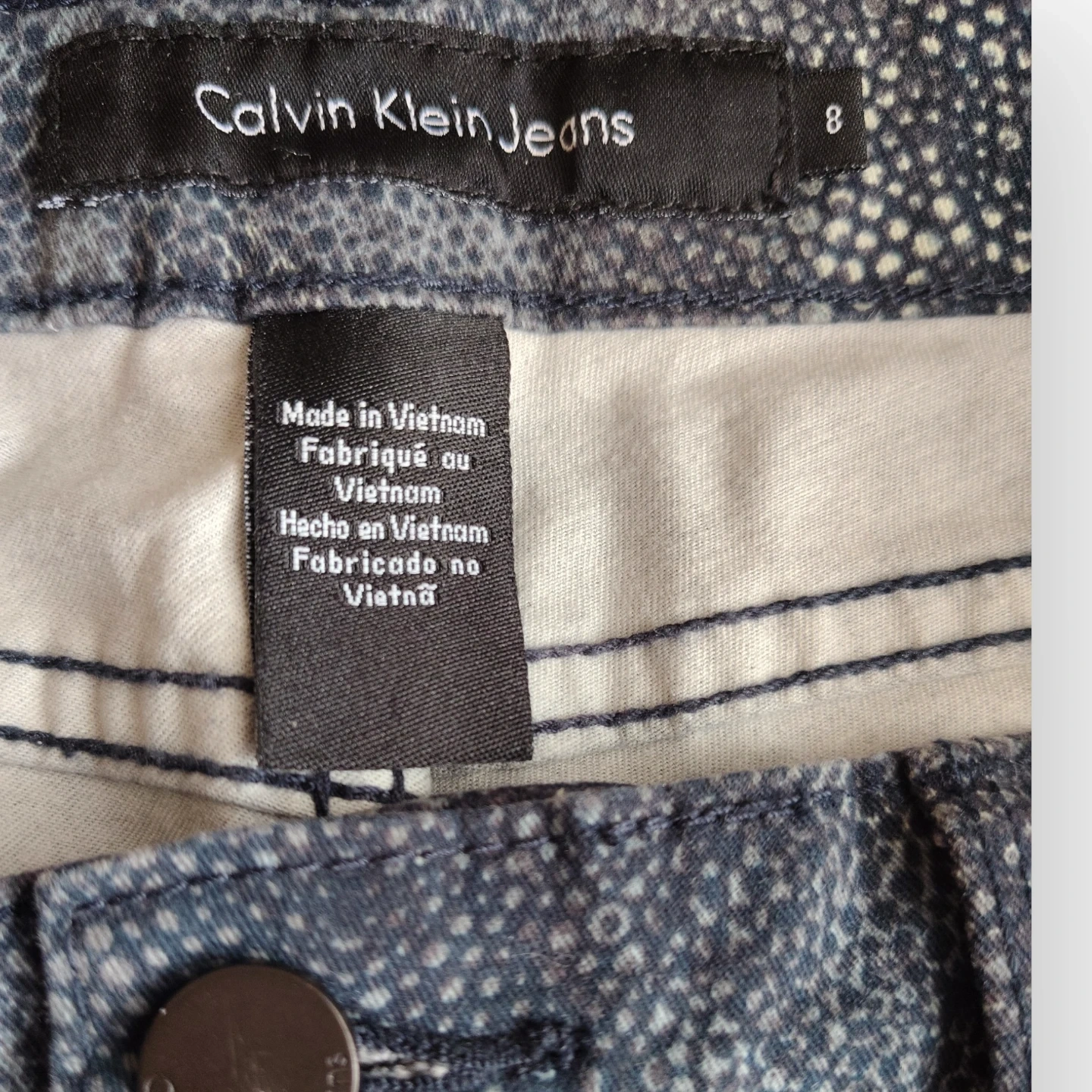 These Calvin Klein Jeans pants are a size 8. They feature a unique dark blue and white speckled pattern. Made in Vietnam.