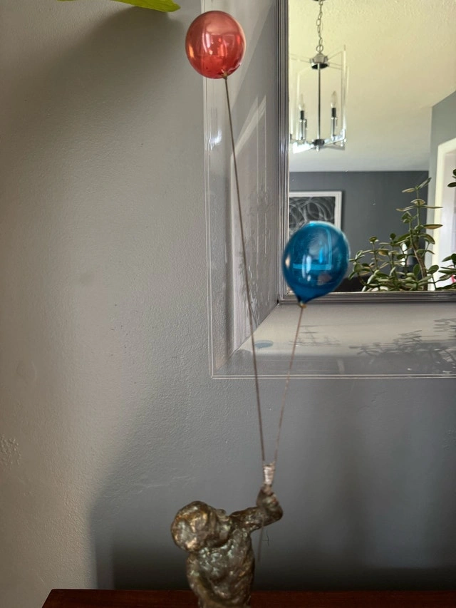 MCM Curtis Jere Bronze Sculpture - Boy and Balloons - signed by Artist. Bronze mounted on a wood base, with the balloons made of colored blown glass.