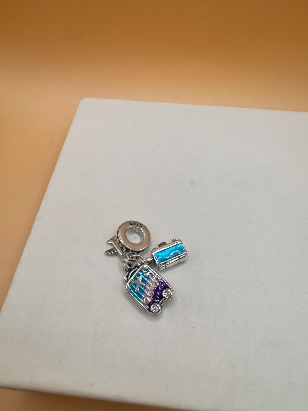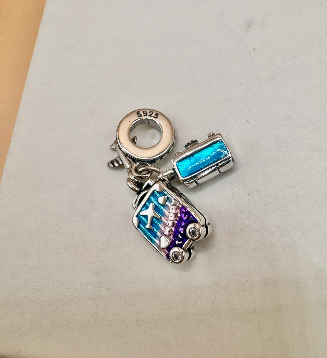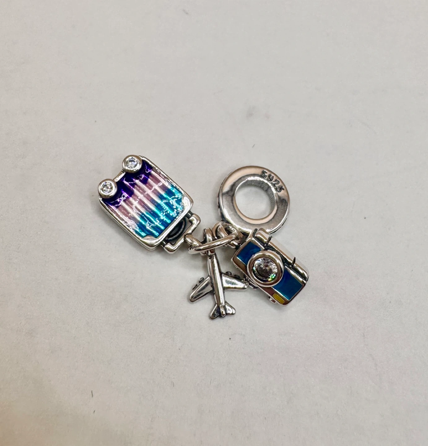 This travel-themed charm features a suitcase, airplane, and camera design. It's made from sterling silver S925. Add a touch of wanderlust to your bracelet!
