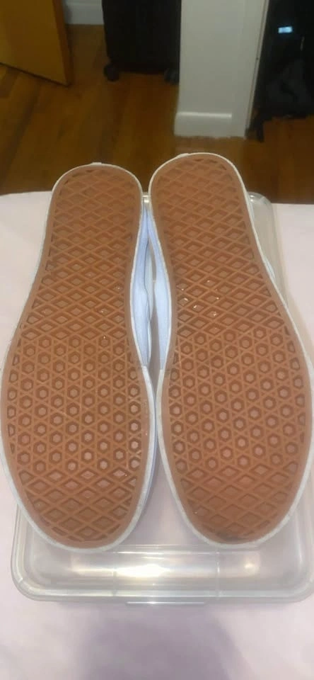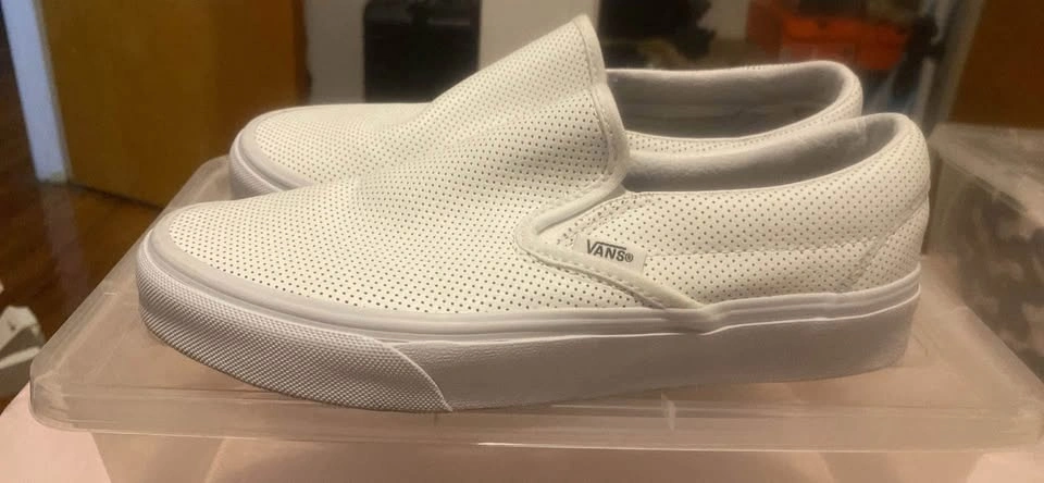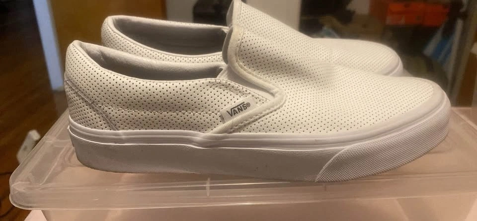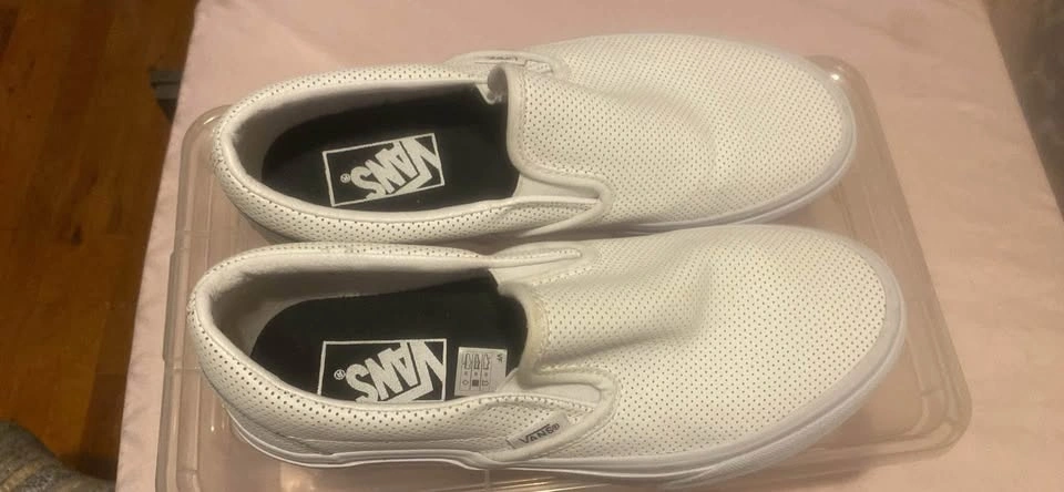 Vans leather white slip-on shoes. Size 6.5 Men / 8 Women. Used only twice. There's a small stain on the inside of the right sole, but it's not visible when wearing them. Pick up only.