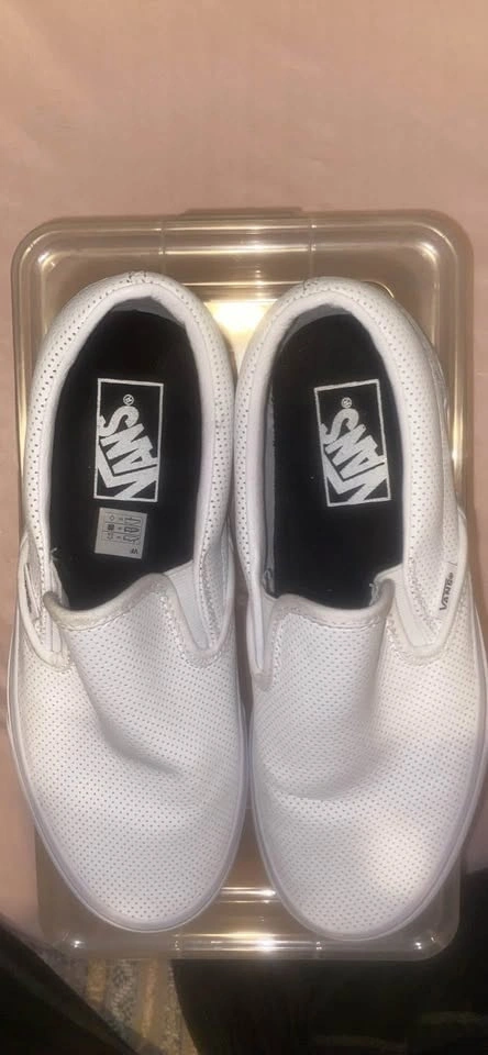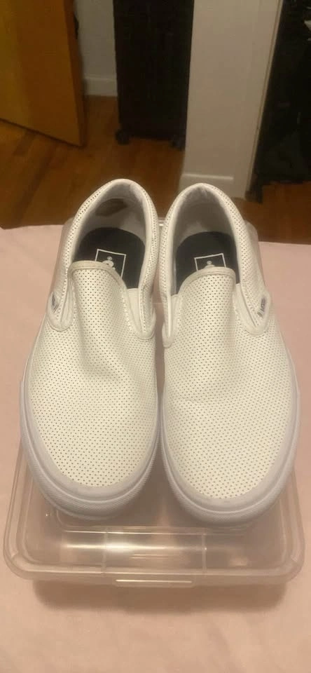 Vans leather white slip-on shoes. Size 6.5 Men / 8 Women. Used only twice. There's a small stain on the inside of the right sole, but it's not visible when wearing them. Pick up only.