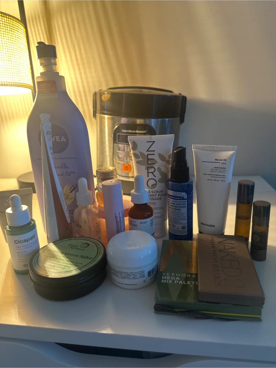 A collection of skincare products including Nivea Vanilla & Almond Oil lotion, Cicapair Tiger Grass Cream, and Dr. Jart+ products. Also includes Zero Skin Scrub, a Sephora Mega Mix Palette and Urban Decay Naked 2 basics. Great for a variety of personal care needs!