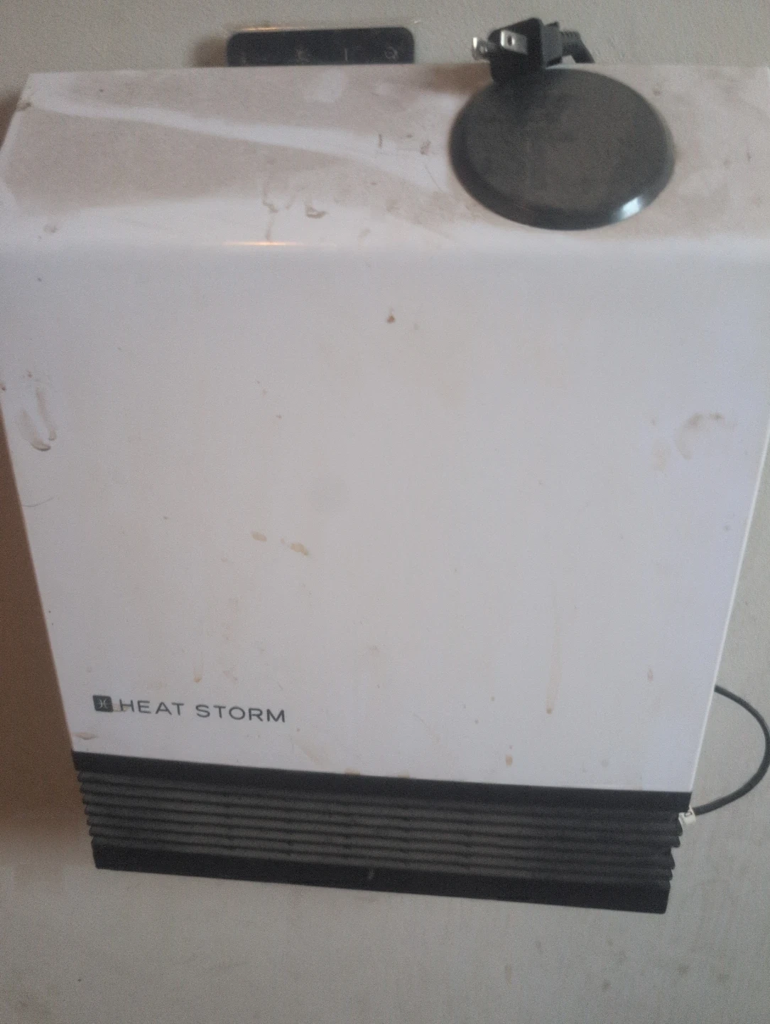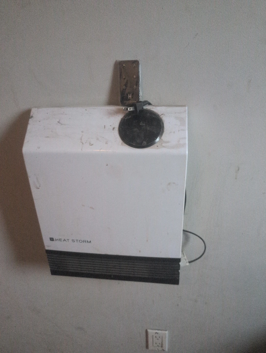 This is a white Heat Storm electric heater. It's a wall-mounted unit with a black base grate. Infrared heater with remote and app control