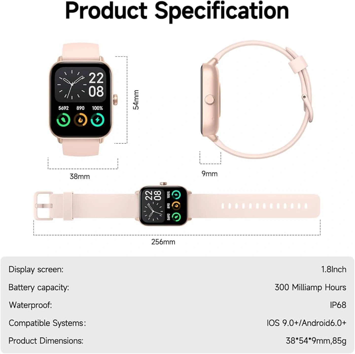 Selling a smart watch with a 1.8 inch HD colour screen. It has a 300 mAh battery capacity and is IP68 waterproof! It's great for tracking your steps and other activities.