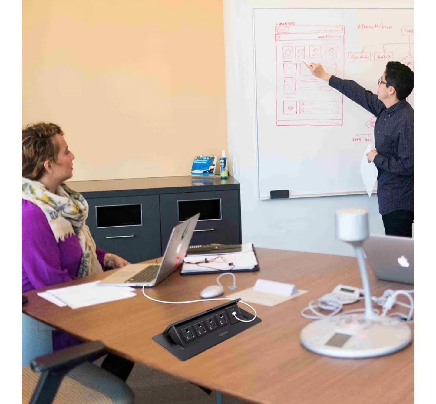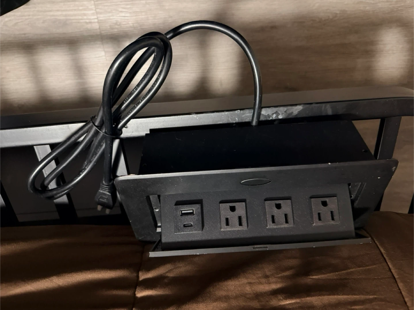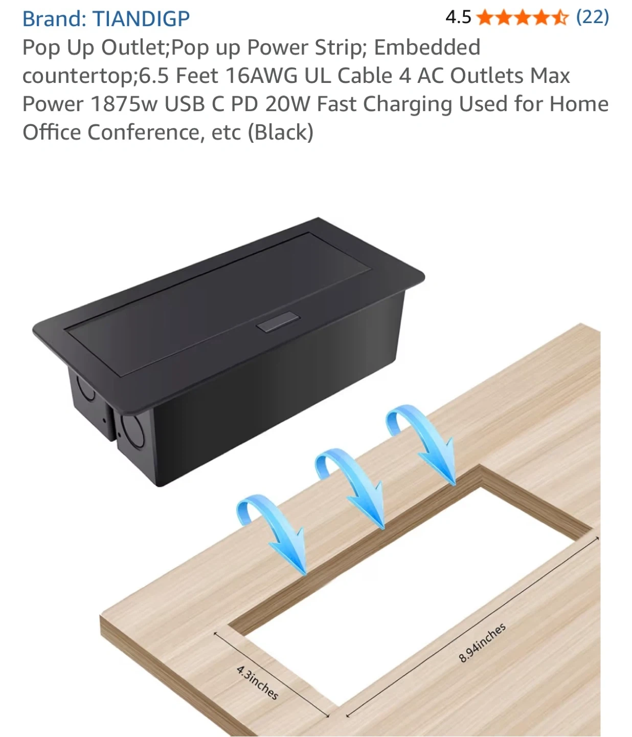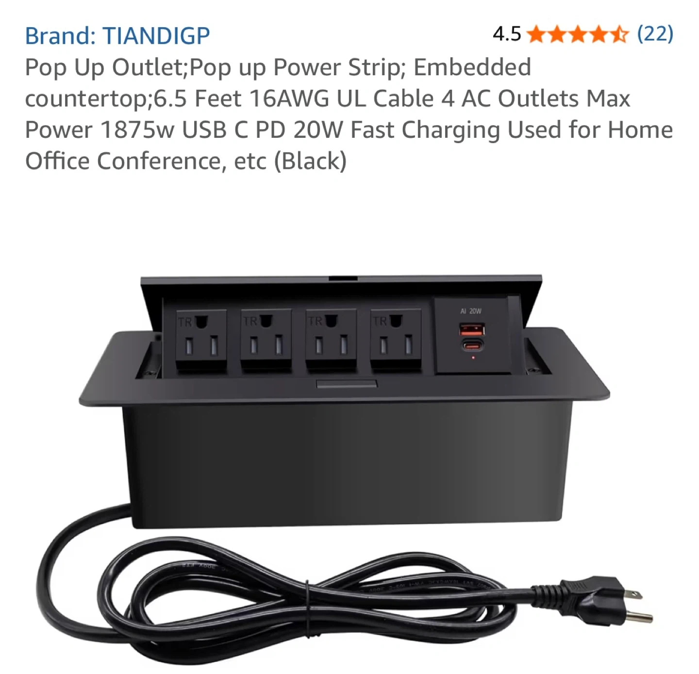 This is a TIANDIGP pop-up power strip with 4 AC outlets and 1 USB & 1 C port. It's ideal for countertops in home offices or conference rooms. The power cord is 6.5 feet long and it supports a max power of 1875W.