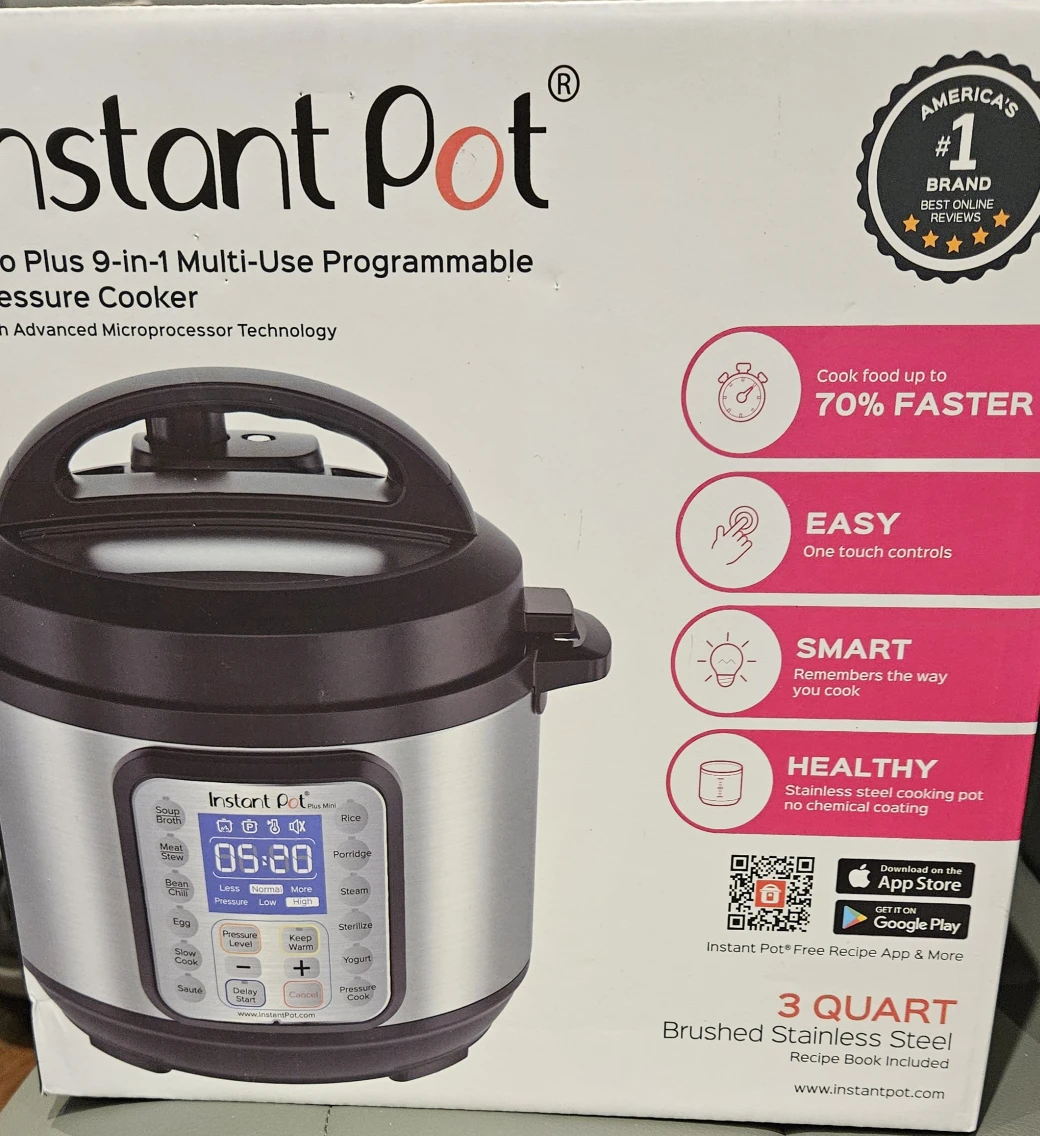 Selling an Instant Pot Plus Mini, a versatile 9-in-1 multi-use programmable pressure cooker! It's a 3-quart model with a brushed stainless steel finish. You can sauté, make yogurt, keep food warm, slow cook, and fast cook with this handy appliance. Cook food up to 70% faster with easy, one-touch controls!