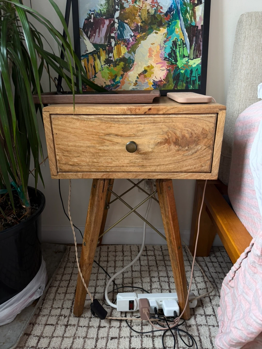 This nightstand features a single drawer with a brass knob. It's made of solid wood with angled legs. Perfect for holding bedside essentials!