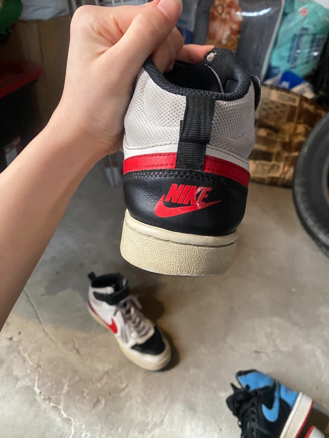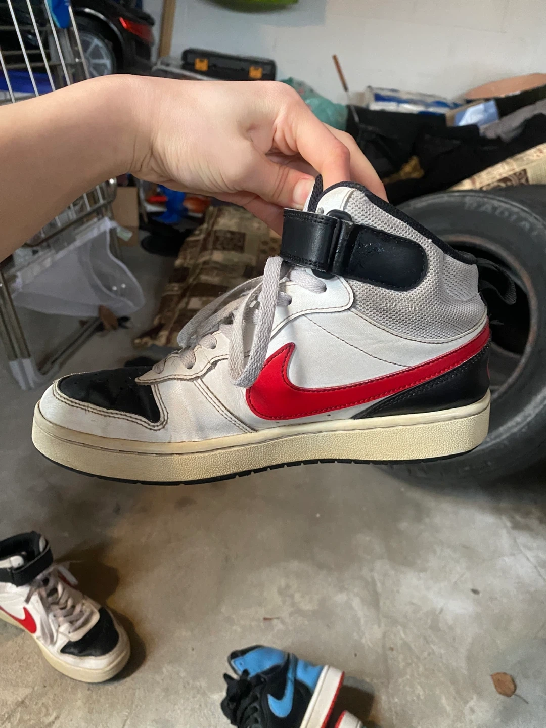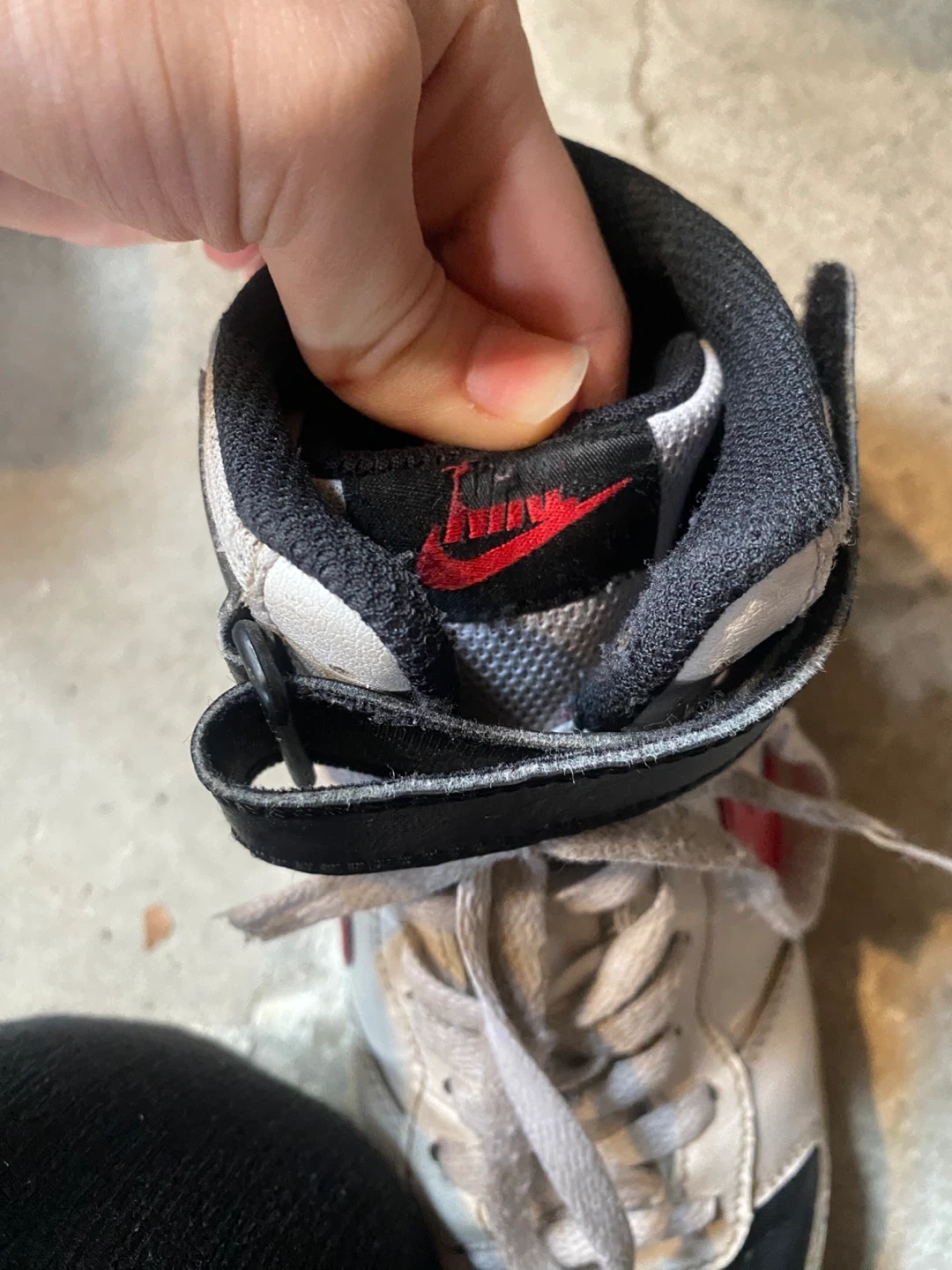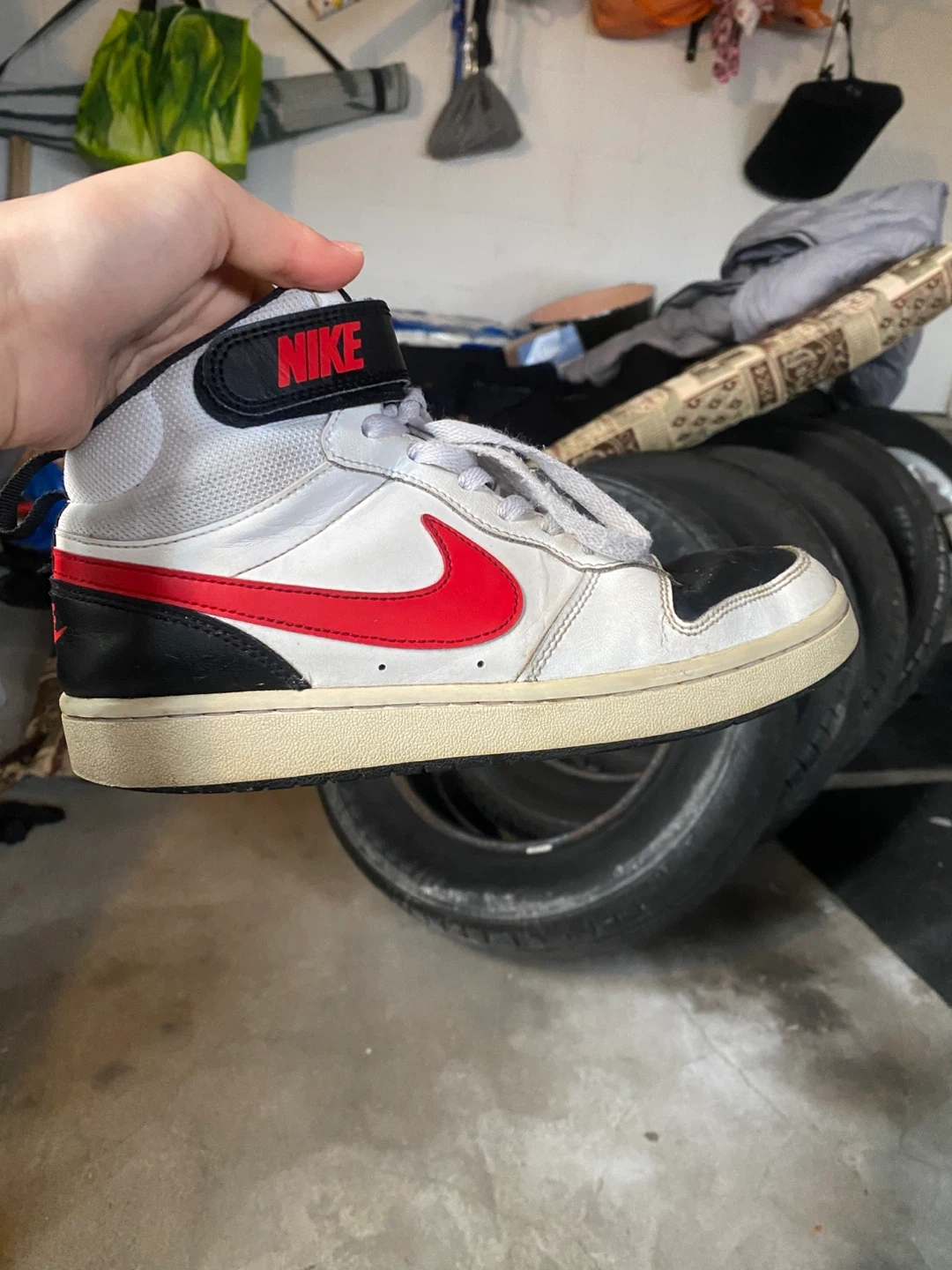 White, black, and red Nike mid-top sneakers with velcro strap closure. These are a classic high-top style shoe. Great for everyday wear!