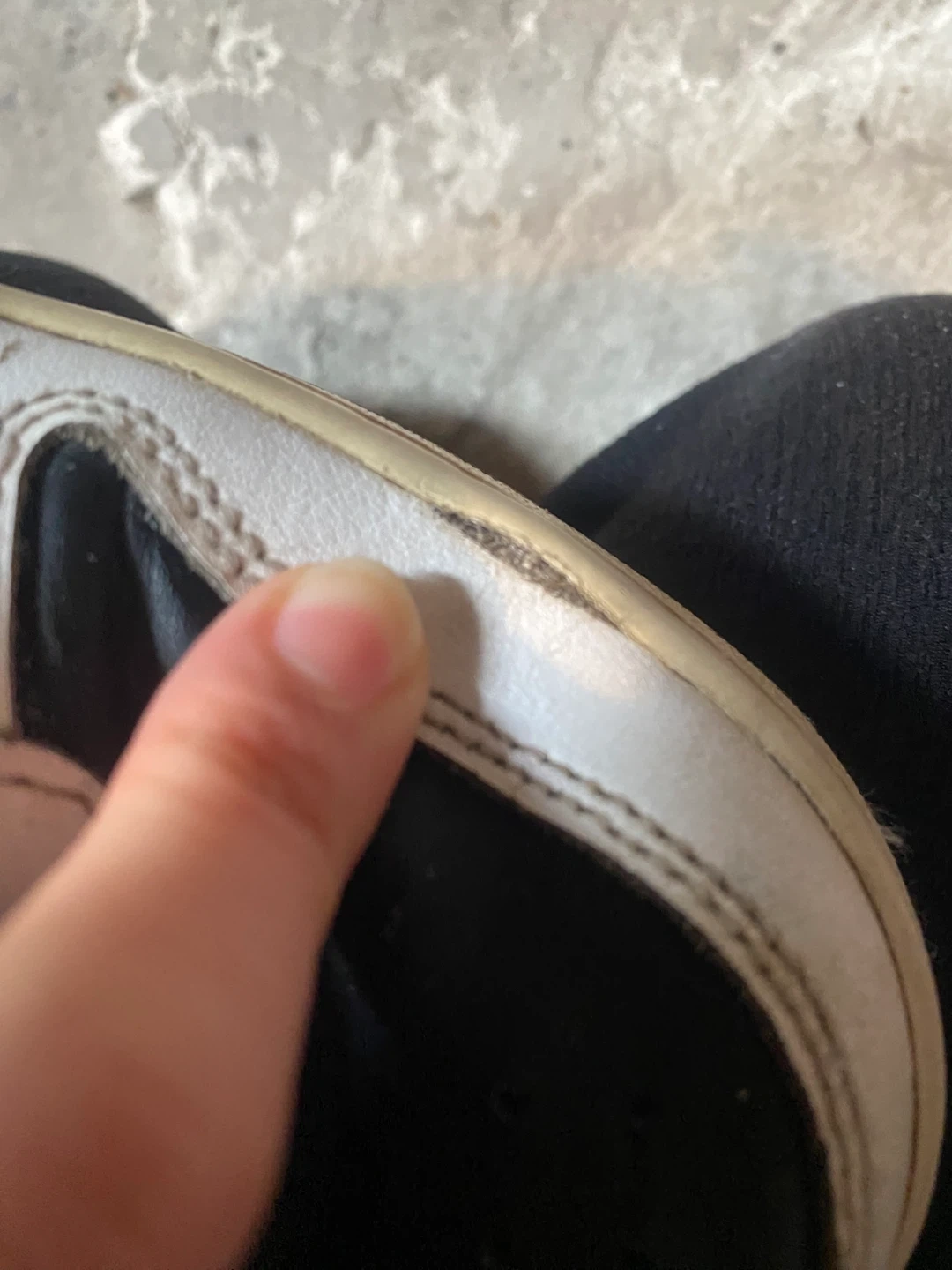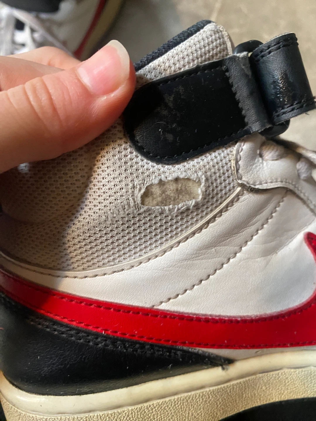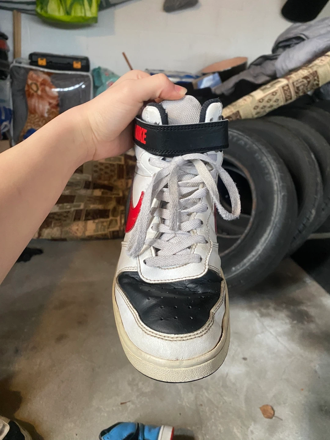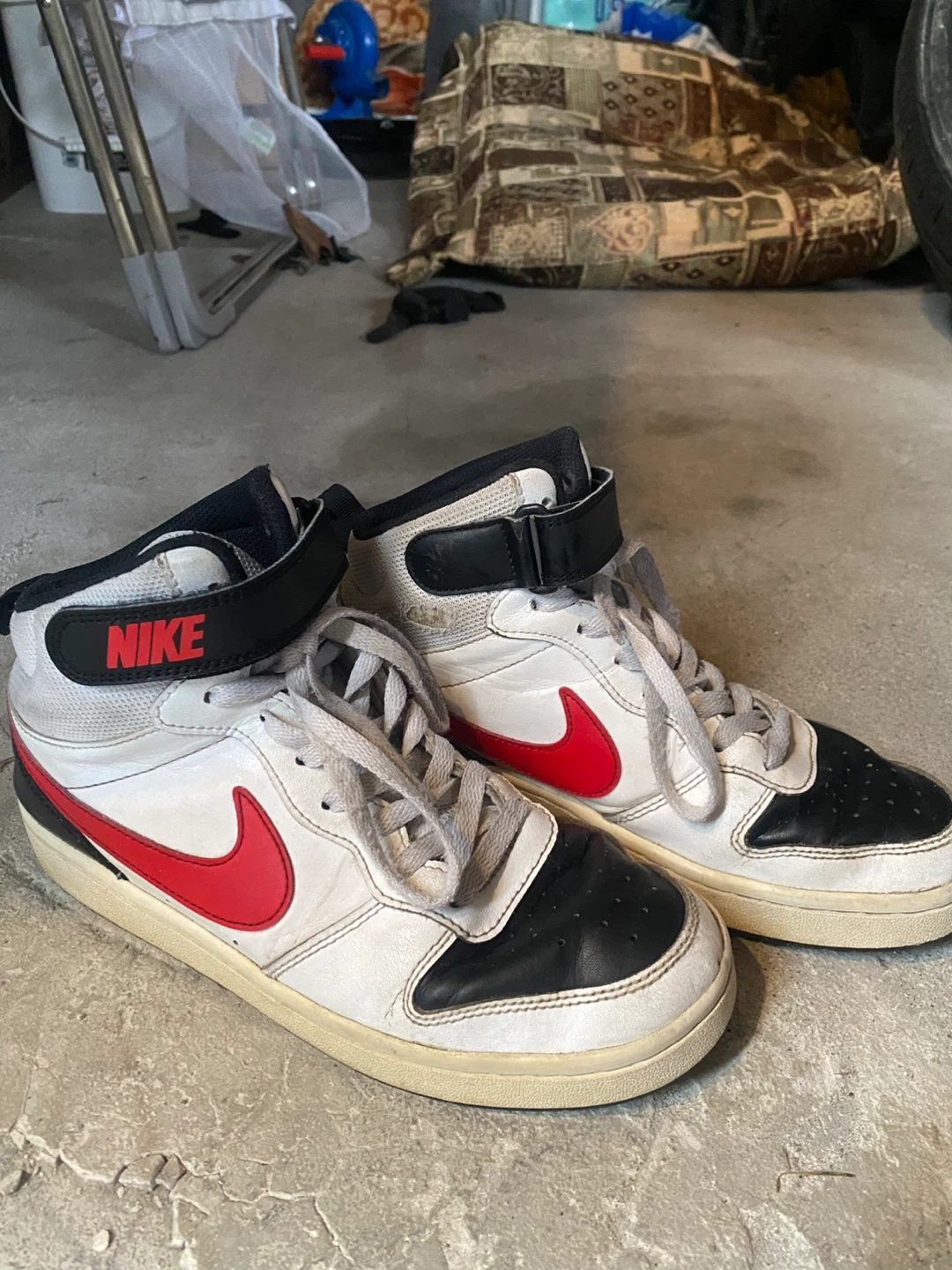 White, black, and red Nike mid-top sneakers with velcro strap closure. These are a classic high-top style shoe. Great for everyday wear!
