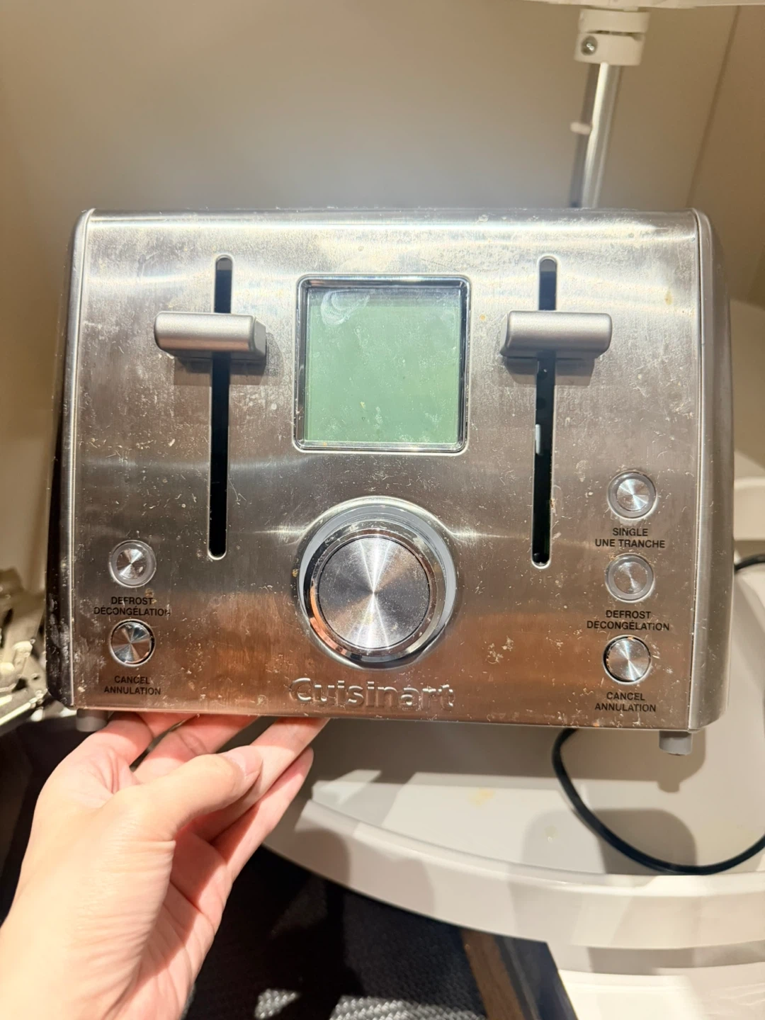 This is a Cuisinart 4-slice toaster with a brushed stainless steel finish. It has dual controls for independent toasting on each side. Multiple browning settings and cancel functions are available.