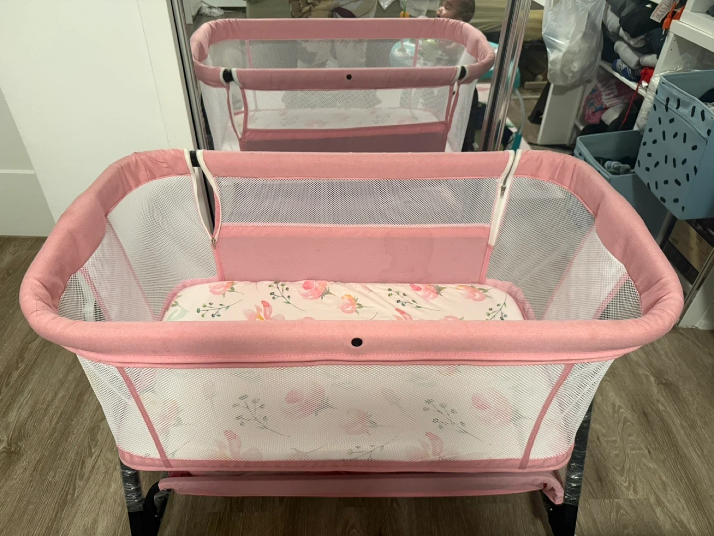 This baby bassinet is pink with a floral pattern on the mattress and sides. It's made of breathable mesh and fabric. Perfect for a nursery.