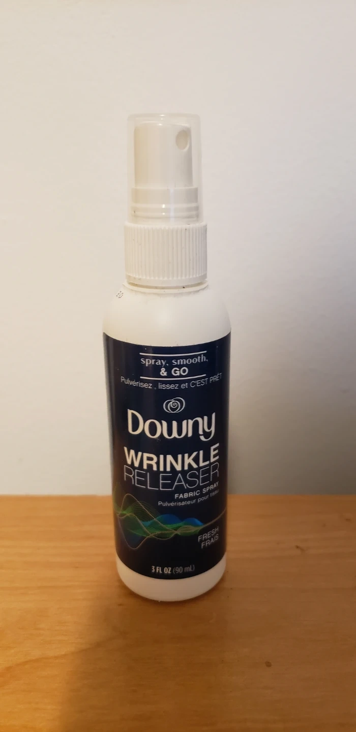 Downy Wrinkle Releaser fabric spray is designed to spray, smooth, and go. It's a convenient way to de-wrinkle fabrics on the go. Available in a 3 fl oz (90 ml) bottle with a fresh scent.