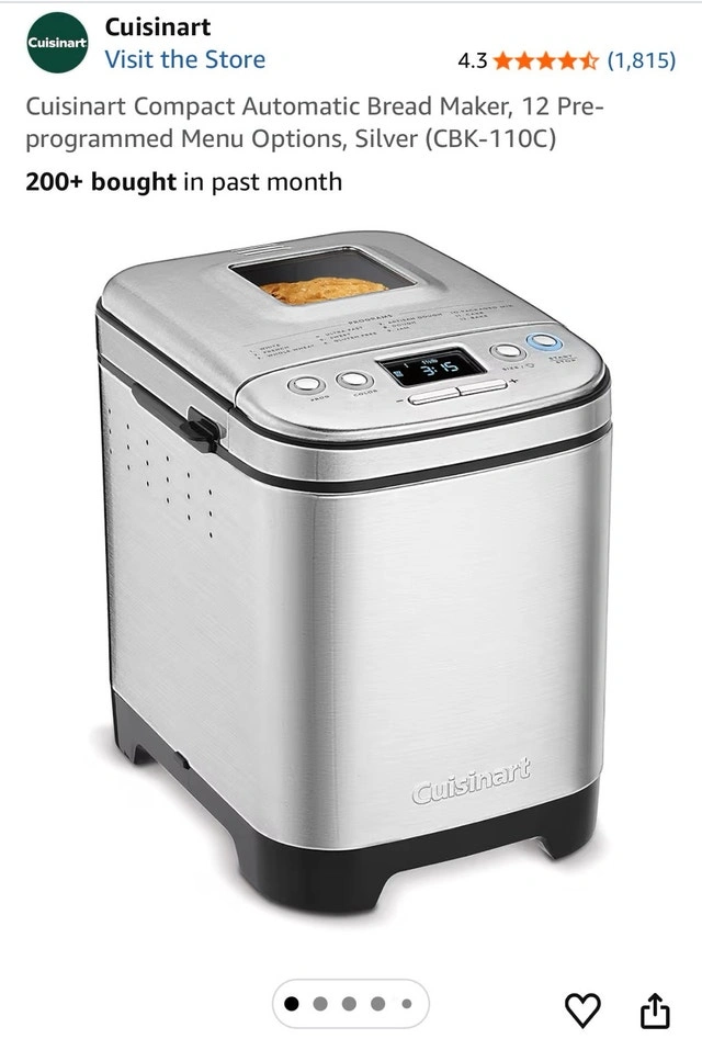 Selling my used Cuisinart Compact Automatic Bread Maker with 12 pre-programmed menu options, perfect for baking various types of bread. This stainless steel bread maker is great for anyone who enjoys fresh, homemade bread with minimal effort. Due to being used, it has some cosmetic imperfections. Features include: 12 pre-programmed menu options, 3 crust settings (light, medium, or dark), 13-hour delay start, and a viewing window to monitor the baking process. The bread pan and kneading paddle are removable for easy cleaning. Comes with recipe booklet!