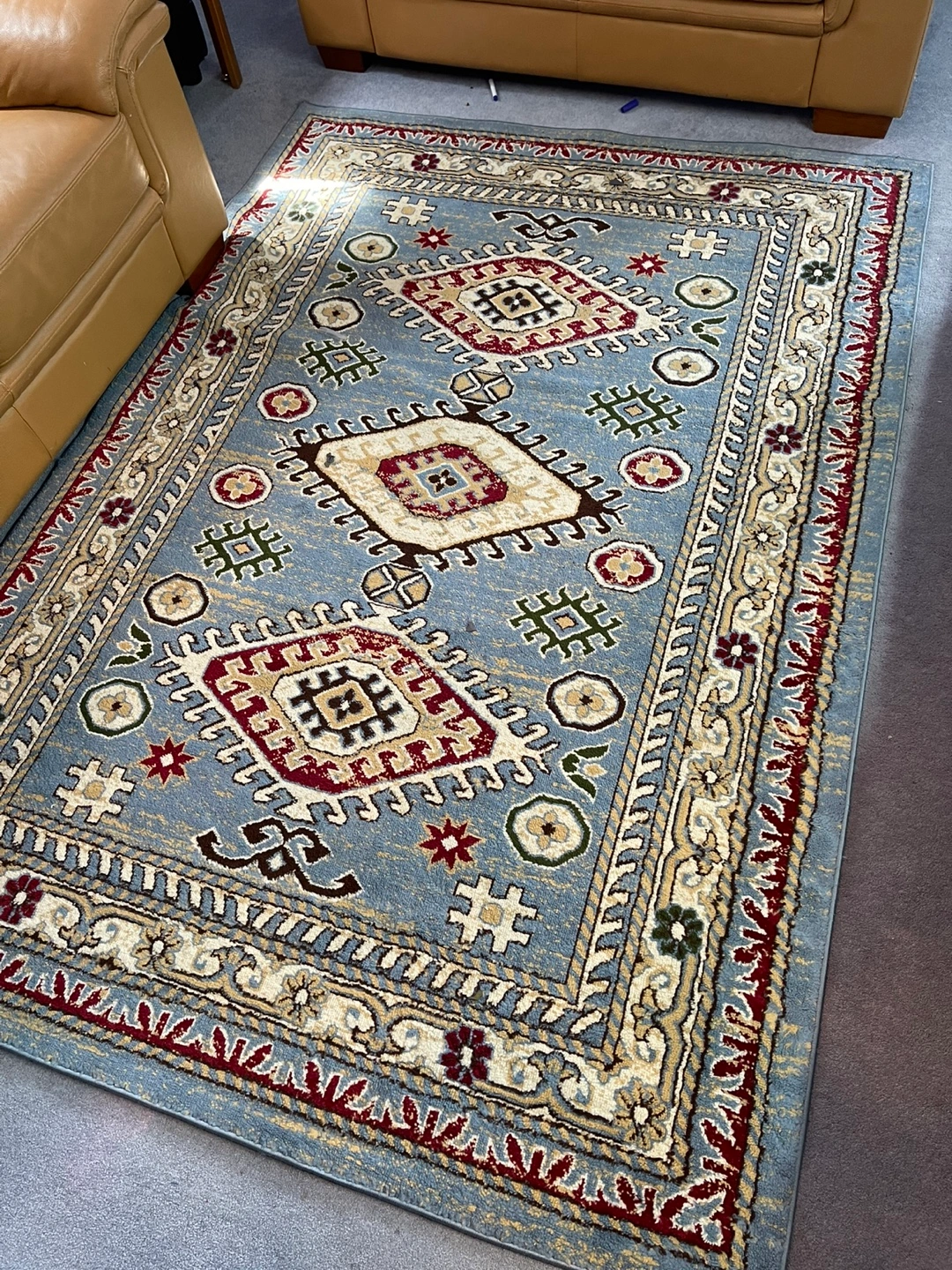 Beautiful rug. Features a blue background with a detailed, multicolored pattern. Adds a touch of elegance to any room. Great for high-traffic areas. Like new
