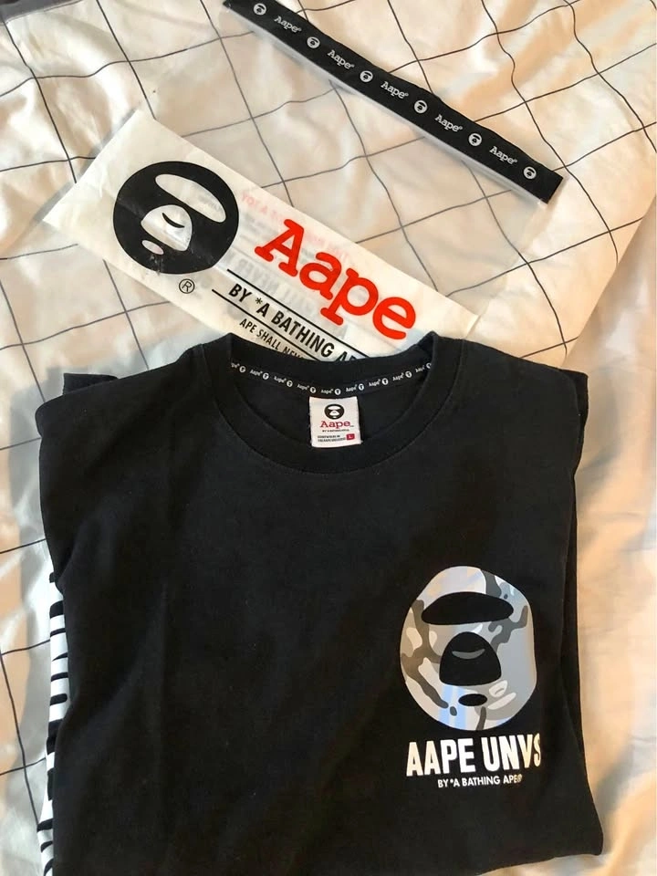 This is an authentic Aape Bape t-shirt. It's a large but can also fit a medium. It comes with the original bag. I've only washed it 2 times and barely worn it.