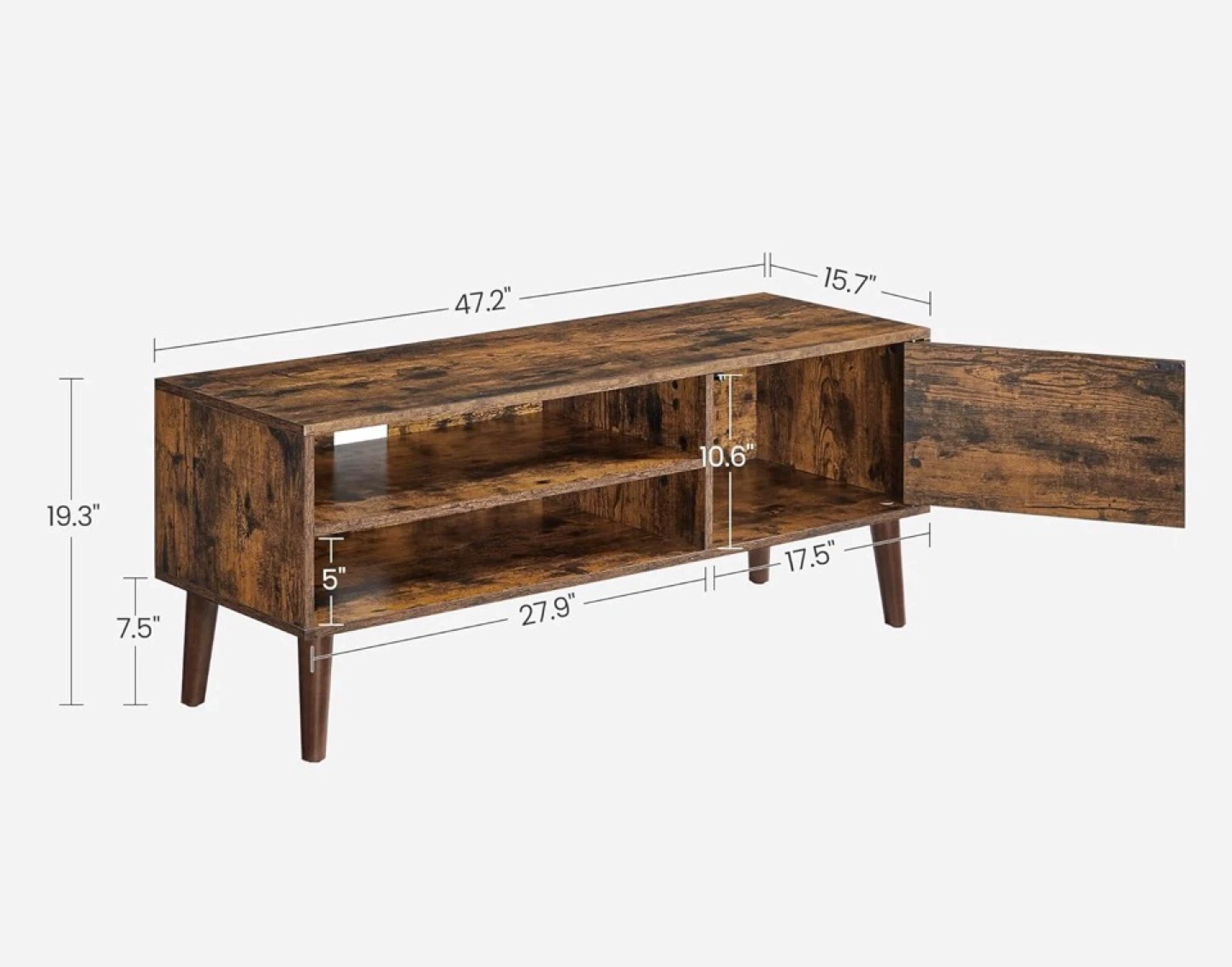 This TV stand features a rustic brown finish with one cabinet and open shelving. It's 47.2" wide and 19.3" tall. The cabinet is 17.5" wide.
