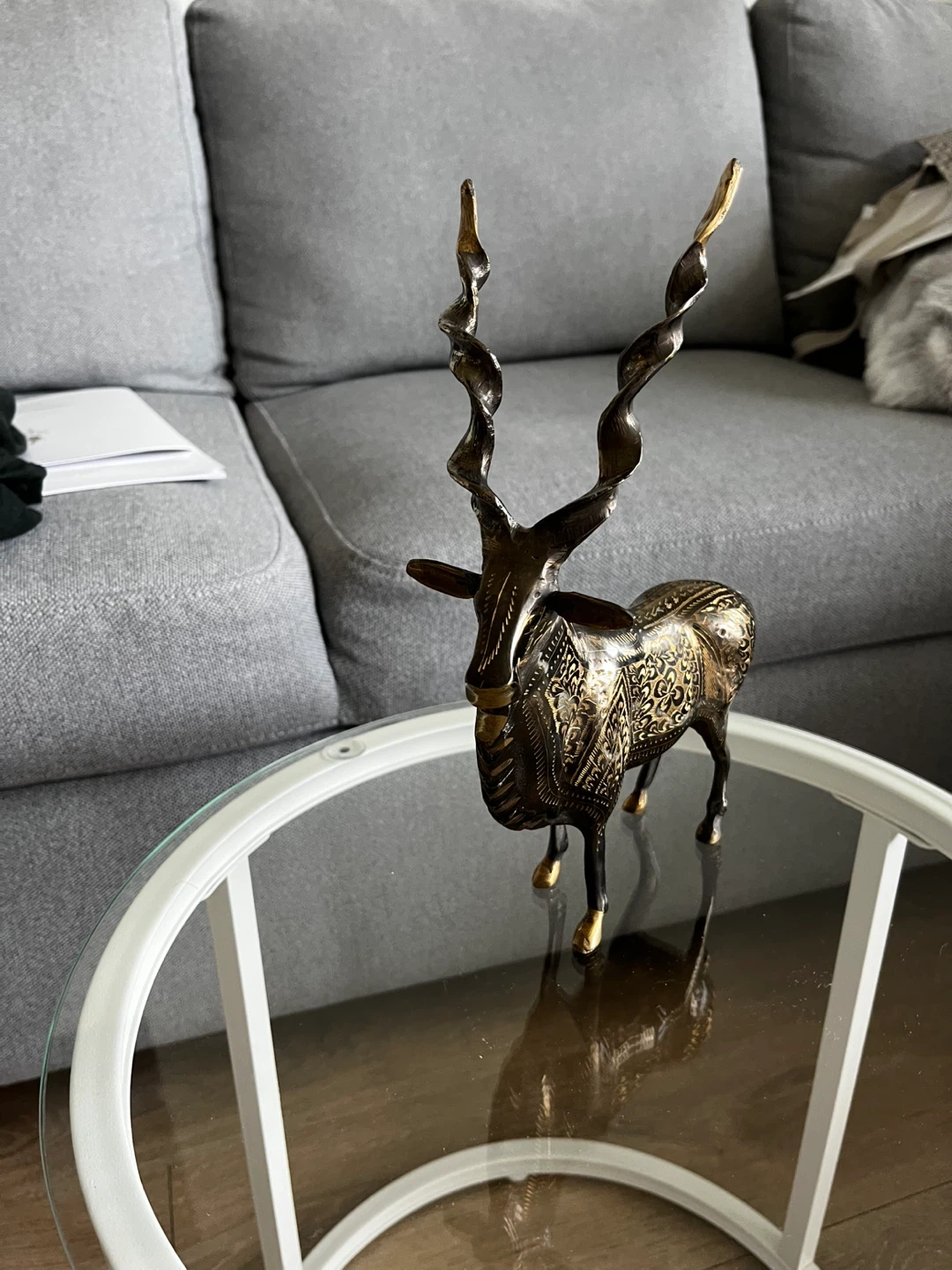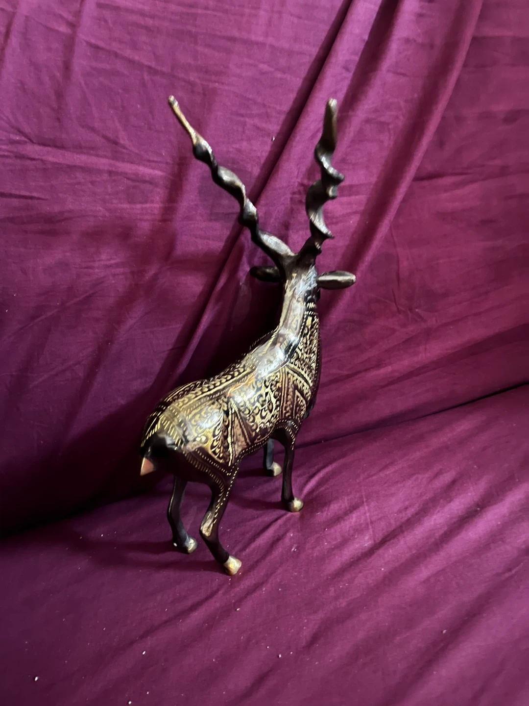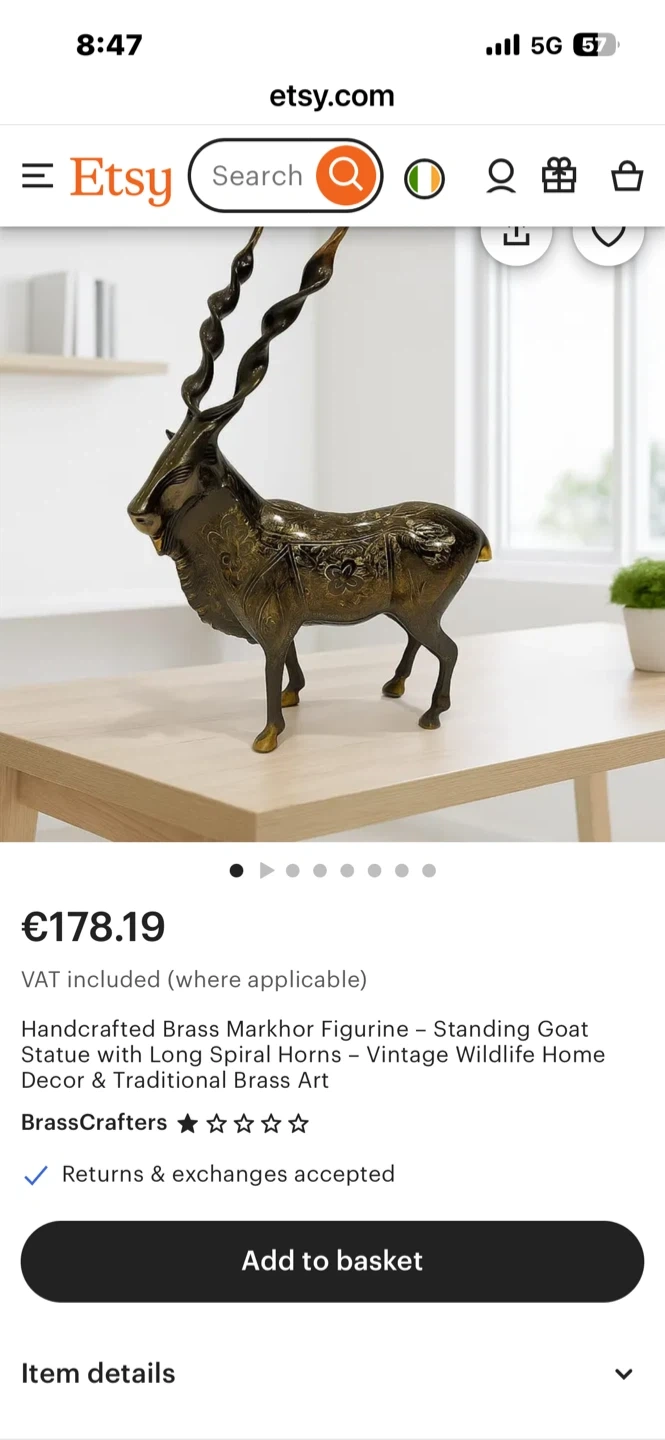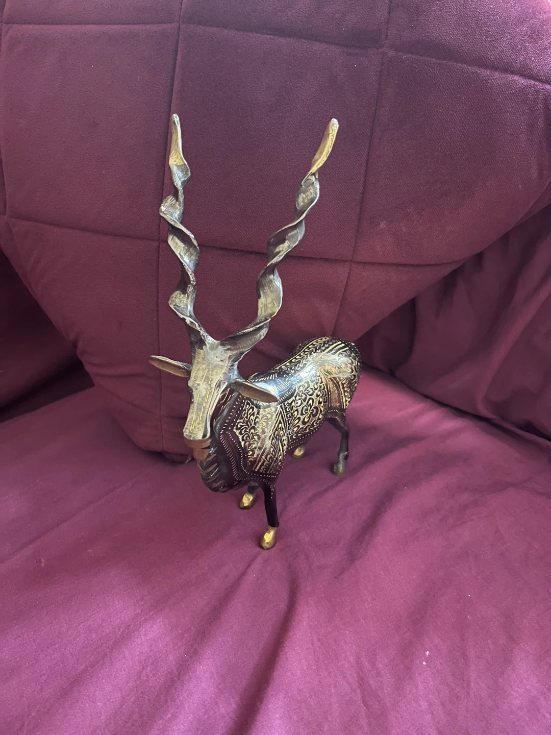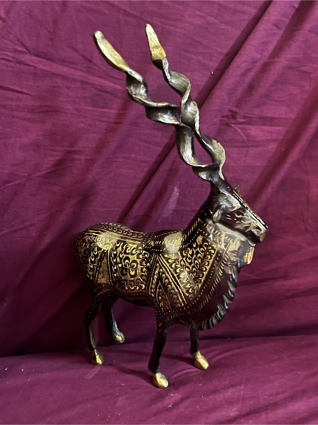 Handcrafted Brass Markhor Figurine - Standing Goat Statue with Long Spiral Horns - Vintage Wildlife Home A decorative statue of an antelope, crafted from brass. It features intricate etched detailing on its body and elaborately twisted horns. This piece would make a striking addition to home decor.