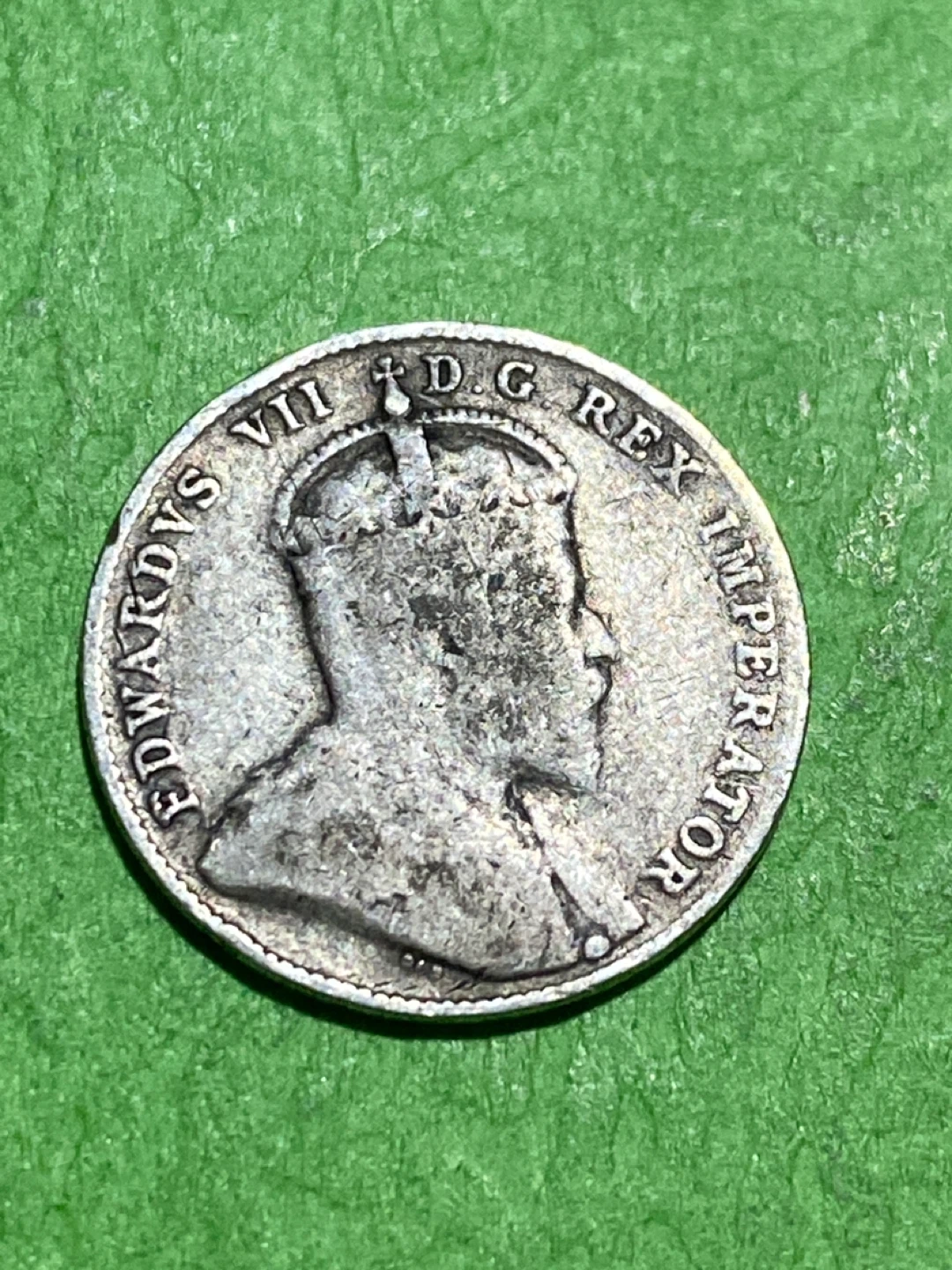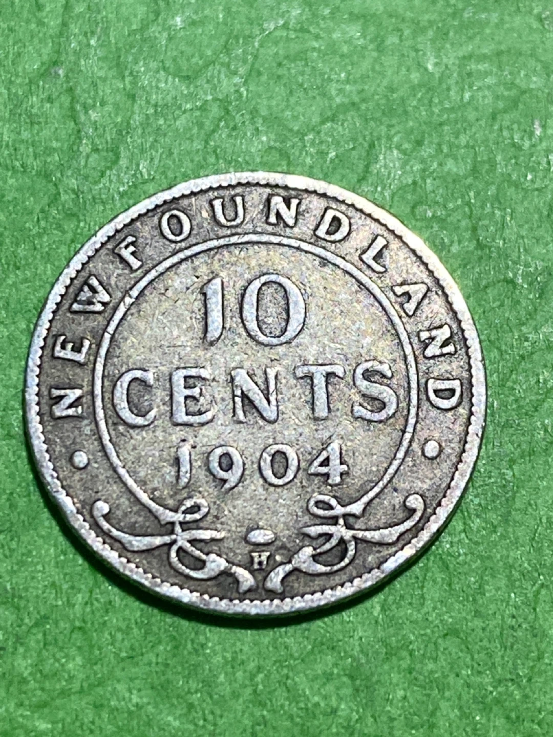 A 1904 Newfoundland 10 cents coin. Features King Edward VII on the obverse and "Newfoundland 10 Cents 1904" on the reverse. This coin is made of silver.
