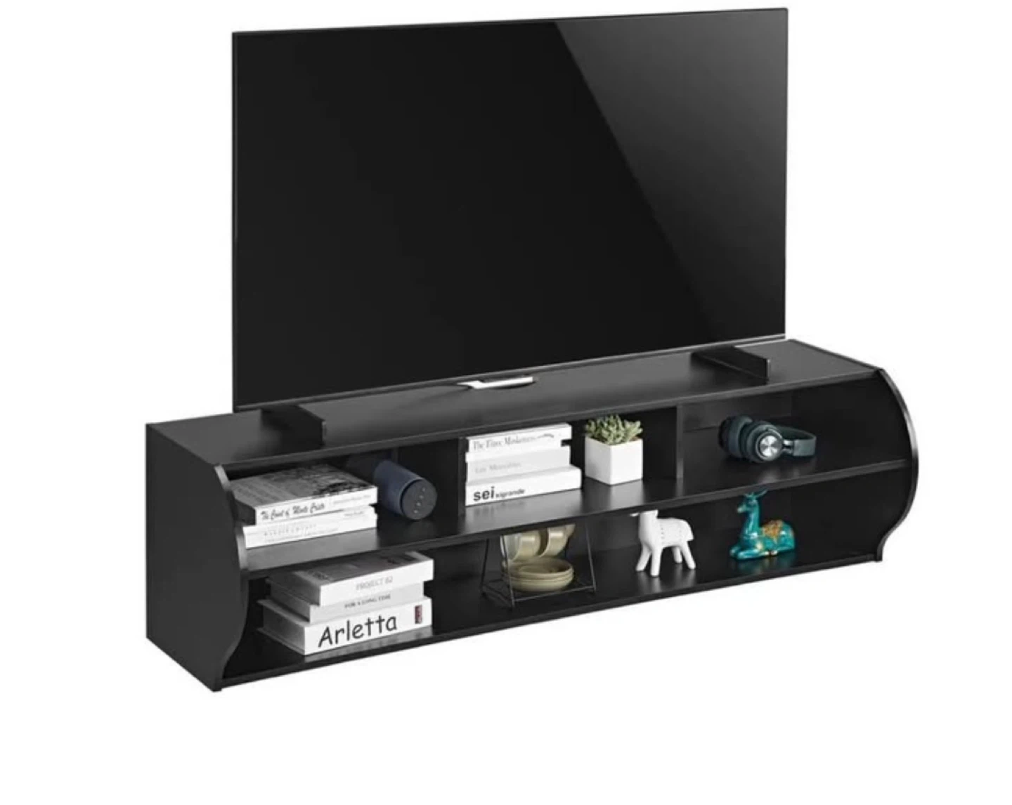 This black TV stand offers multiple shelves for storage and display. It's a sleek addition to any living room! The stand is made of durable material and features a modern design. It's suitable for holding your TV and other media components , comes with bracket to hang on wall.