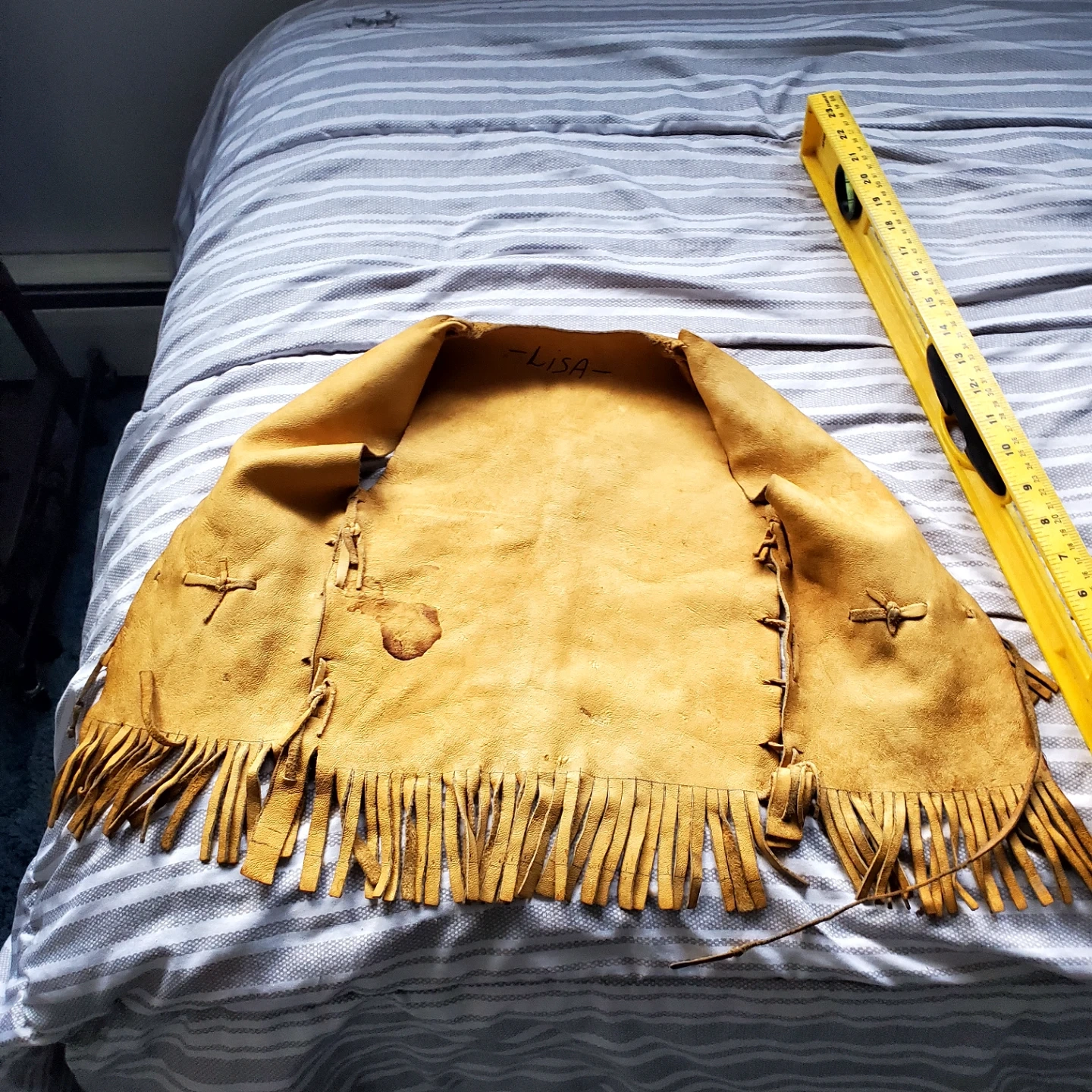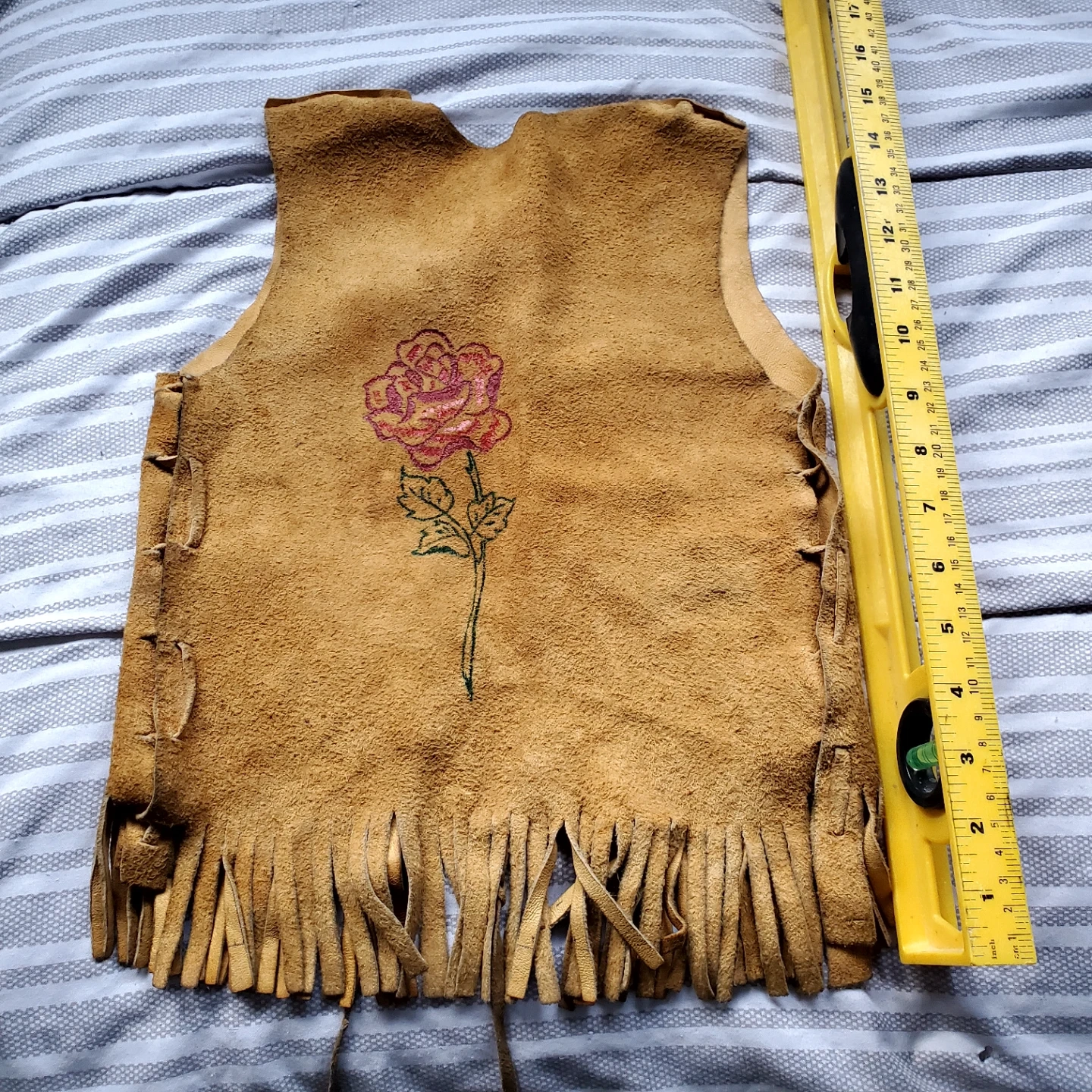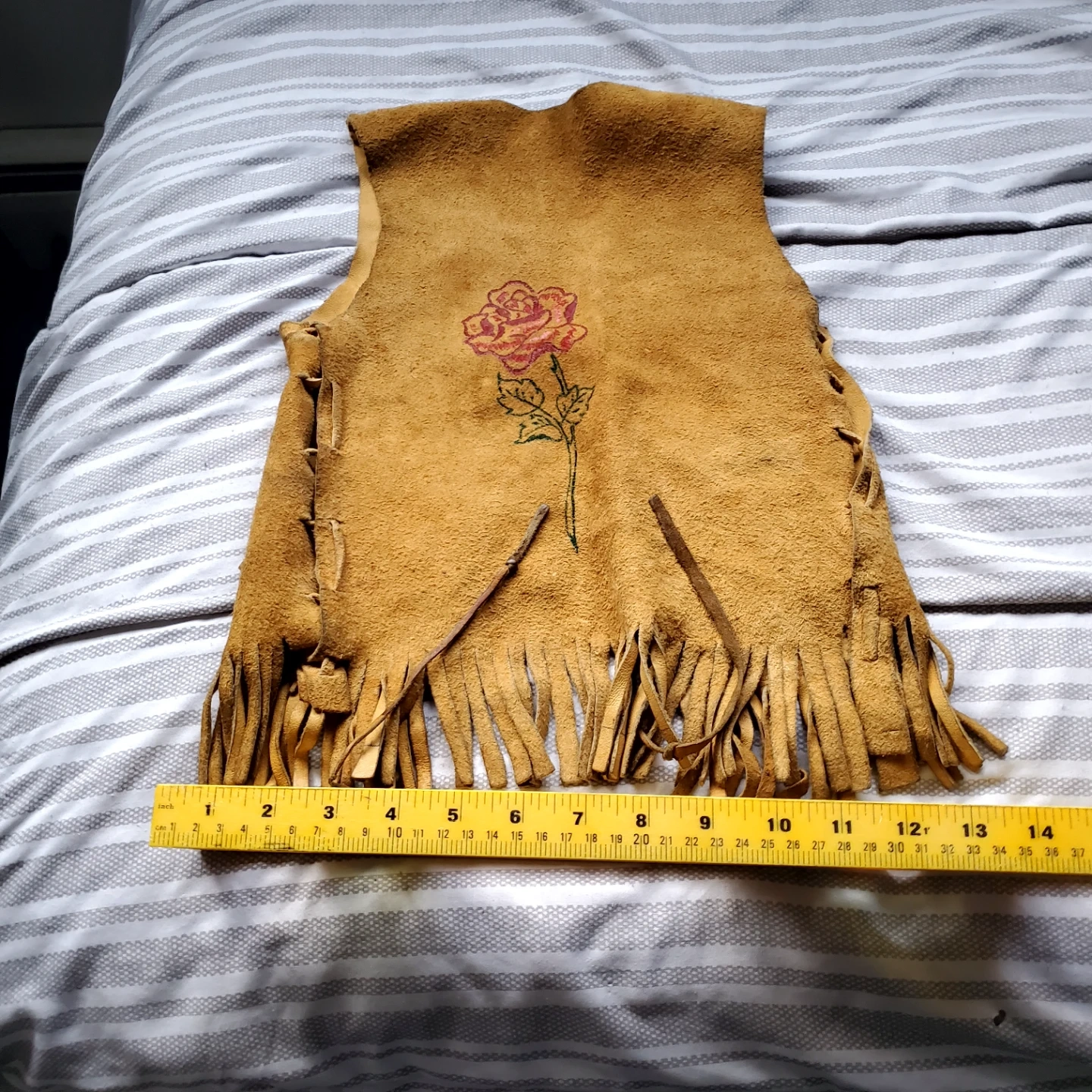 Tan suede leather vest with a hand-painted rose design on the front. It features fringe detailing along the bottom and sides, and ties on the sides for closure. The interior collar has the name "Lisa" written on it. Measurements are approximately 16 inches from shoulder to hem. This is Silmilkameen Indian apparel worn by my sister. Needs to Dance again. I have two...Mine and my Sister's...both are 55 yrs old. Hand made by my Auntie.